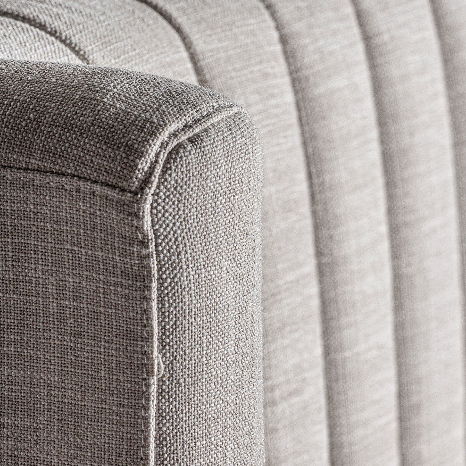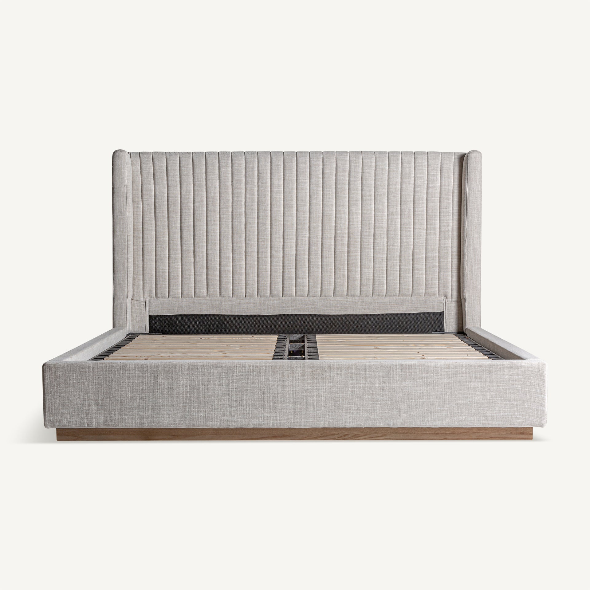 The Aunac bed, upholstered in grey polyester with a pine wood structure, offers a sober and contemporary aesthetic. Its low design and clean lines make it the perfect resting centerpiece. A piece by VICAL with presence and balance.