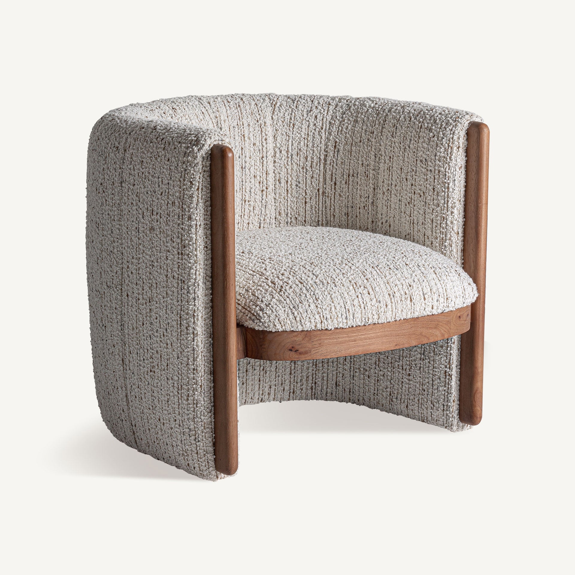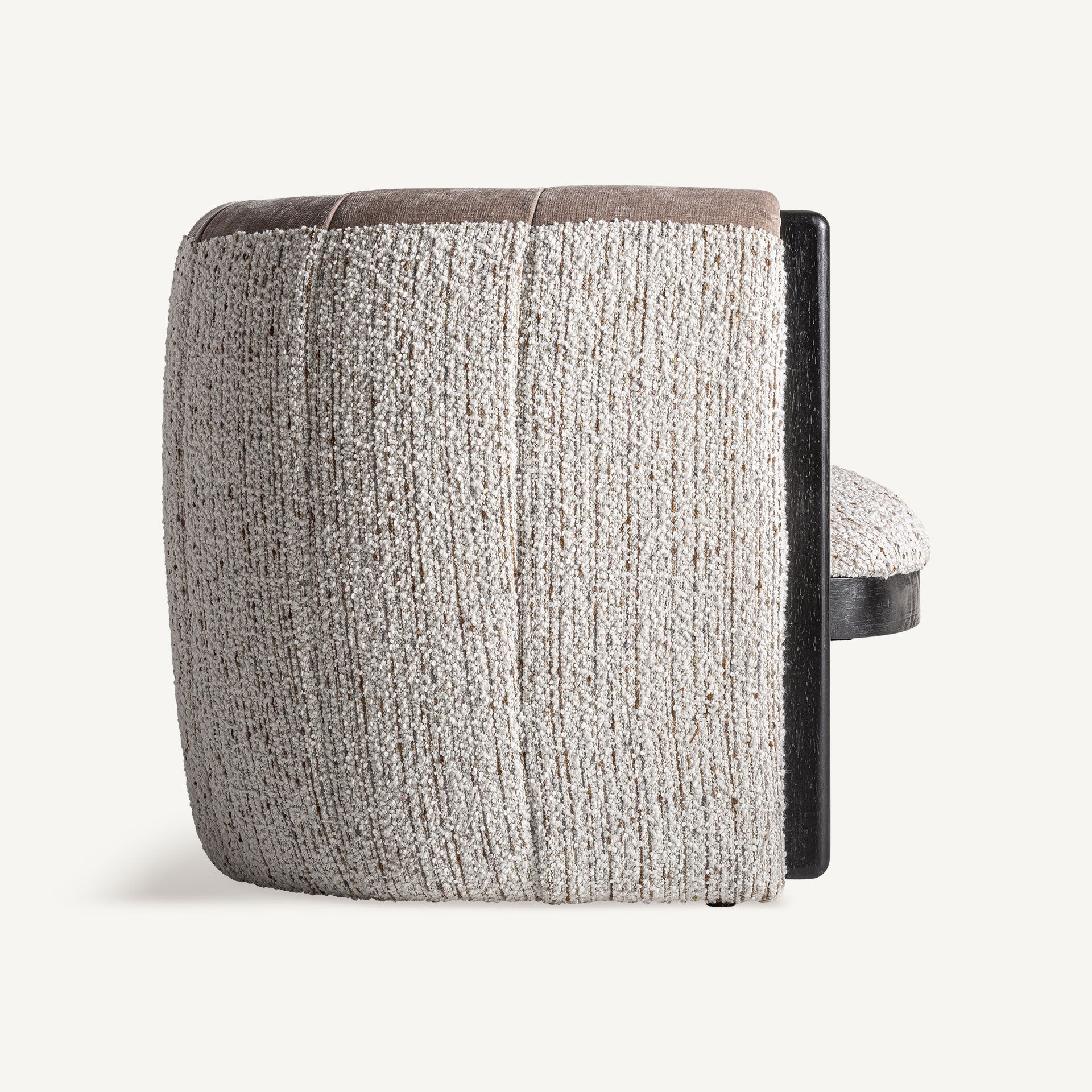 The Erbach armchair, upholstered in black polyester and combined with taupe pine wood, stands out for its art deco design and sober aesthetic. Its enveloping shape and soft texture make it an elegant and functional piece. A proposal by VICAL.