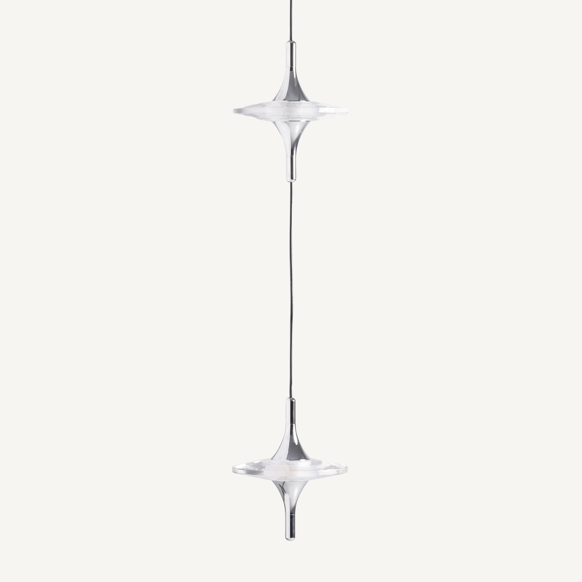Скулптурна плафонна лампа, която съчетава футуристична елегантност с прецизност на занаятчийството. Със симетричен дизайн, фасетиран прозрачен диск и полирани метални краища, тази лампа създава завладяваща игра на светлина и форма. Идеална за модерен интериор, бутикови пространства или среди, вдъхновени от галерии.