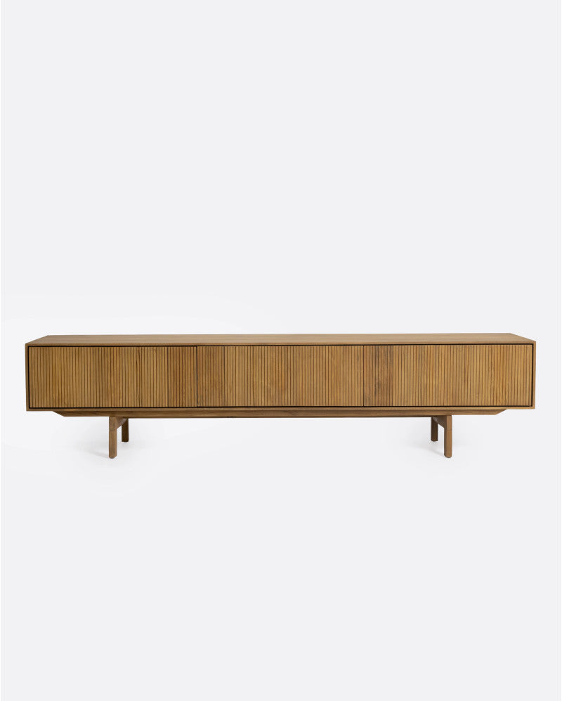 В колекцията BALARI всяко парче се отличава със своя изискан модел от успоредни линии, издълбани на ръка, използвайки техниката на занаятчийска резба. Прецизен процес, който прави всяка мебел уникална, отразявайки нашата отдаденост на майсторството и вниманието към детайла. Цялата колекция е направена изцяло от рециклиран тик, материал, който предлага устойчивост и издръжливост.
