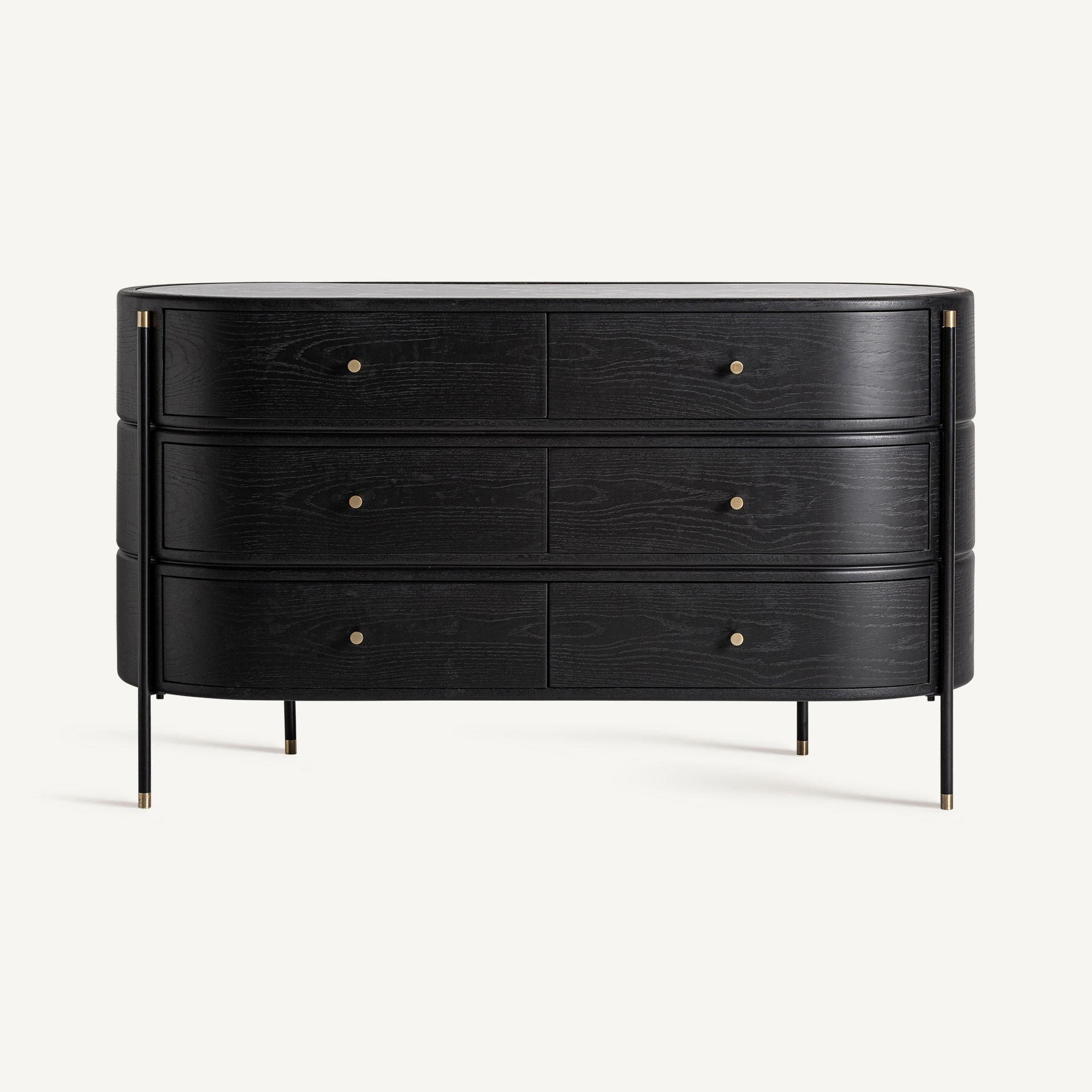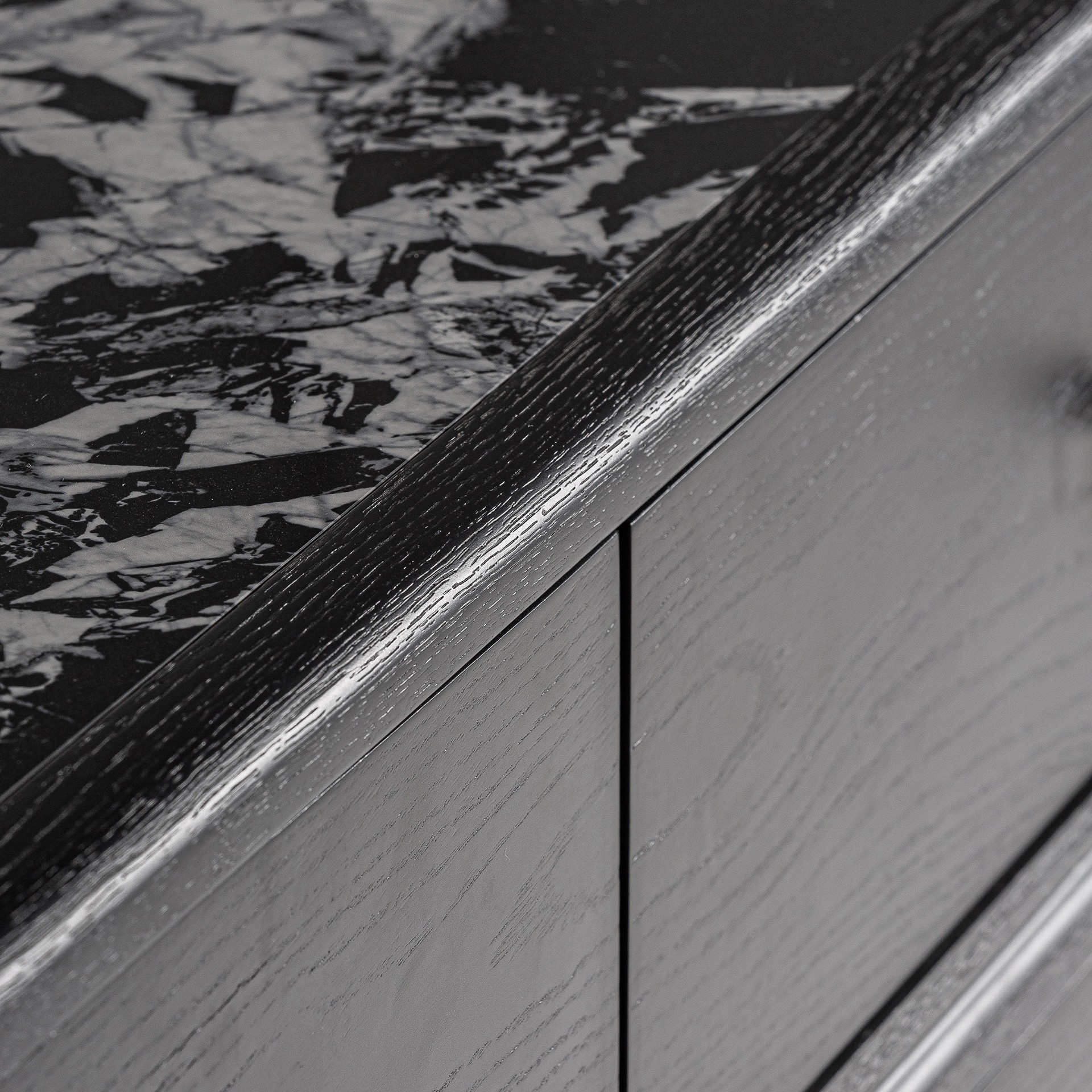 Скринът Bilzen, с черна MDF конструкция и шарени керамични детайли, предлага съвременна естетика с характер. Непретенциозният му дизайн и текстурирано покритие го правят функционално и декоративно мебелно изделие. VICAL придава на това изделие неповторим печат.