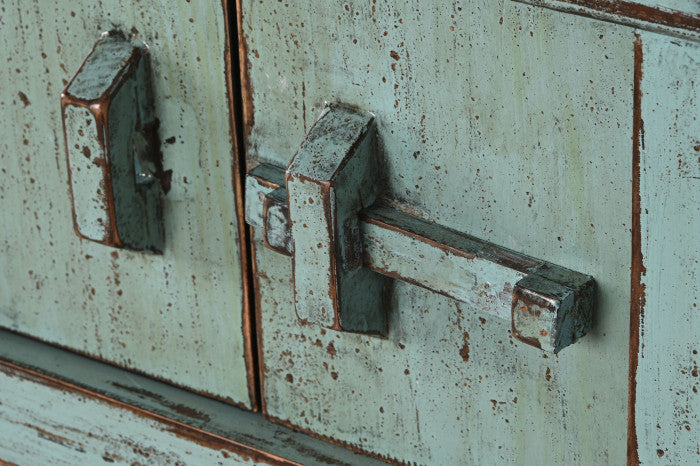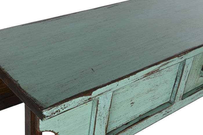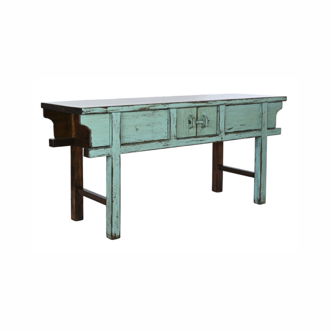 Тази конзолна маса във винтидж стил разполага с централен шкаф с двойни врати и традиционна метална закопчалка, която се отваря, за да разкрие просторен интериор, идеален за съхранение на важни вещи, скрито от погледа. Обградена от отворени отделения и акцентирана с тюркоазена боя, тя съчетава практичност с бохемска елегантност.