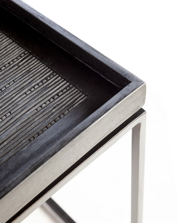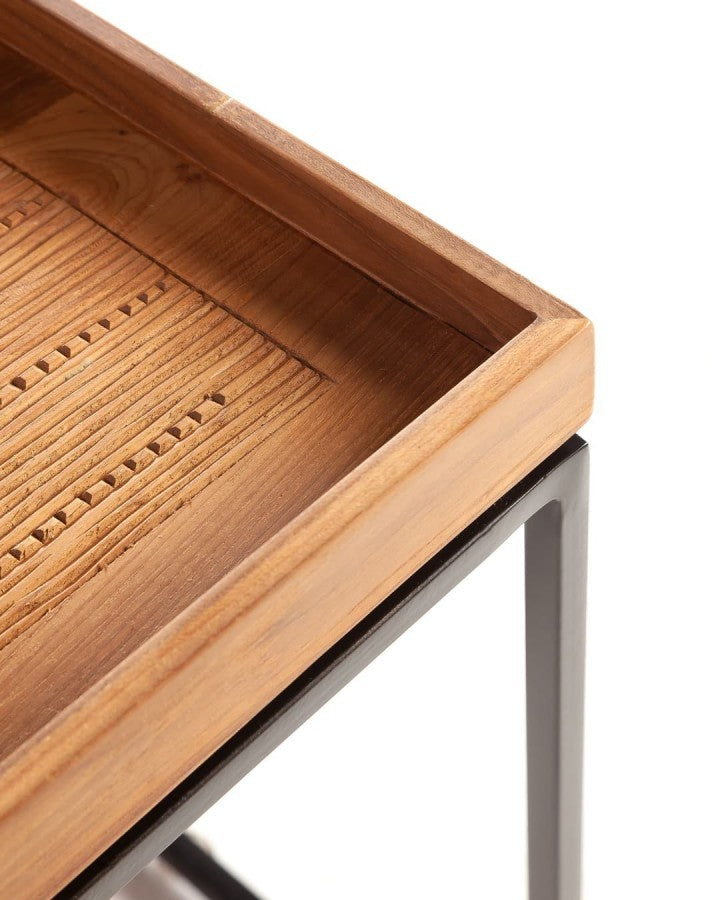 - Финал на краката: Прахово покритие Тази фина ръчно изработена странична масичка е ексклузивен дизайнерски елемент, който съчетава нейния минималистичен външен вид в скандинавски стил с качествени традиционни детайли, издълбани един по един в повърхността на дървото, придавайки й собствена безпогрешна занаятчийска стойност. Основната структура, изработена от тънки и елегантни железни линии в черно, се съчетава идеално с квадратната част на плота, изработена от естествен рециклиран тик и в този случай в черно. Устойчива и оригинална мебел, с етнически, но трезвен вид, която ще изглежда страхотно във всекидневната, кухнята или спалнята, в непретрупана среда и с други елементи в индустриален стил. Предлага се и с дървото в оригиналния цвят.