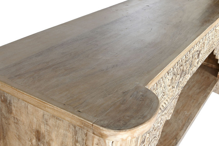 Изработена от масивна дървесина и щателно ръчно резбована, конзолната маса CARVE 233 см демонстрира изключително майсторство на индонезийските занаятчии. Просторната ѝ повърхност и здравата конструкция предлагат едновременно елегантност и издръжливост, което я прави отличителен централен елемент за всяко пространство, търсещо изискана изработка и вечен дизайн.