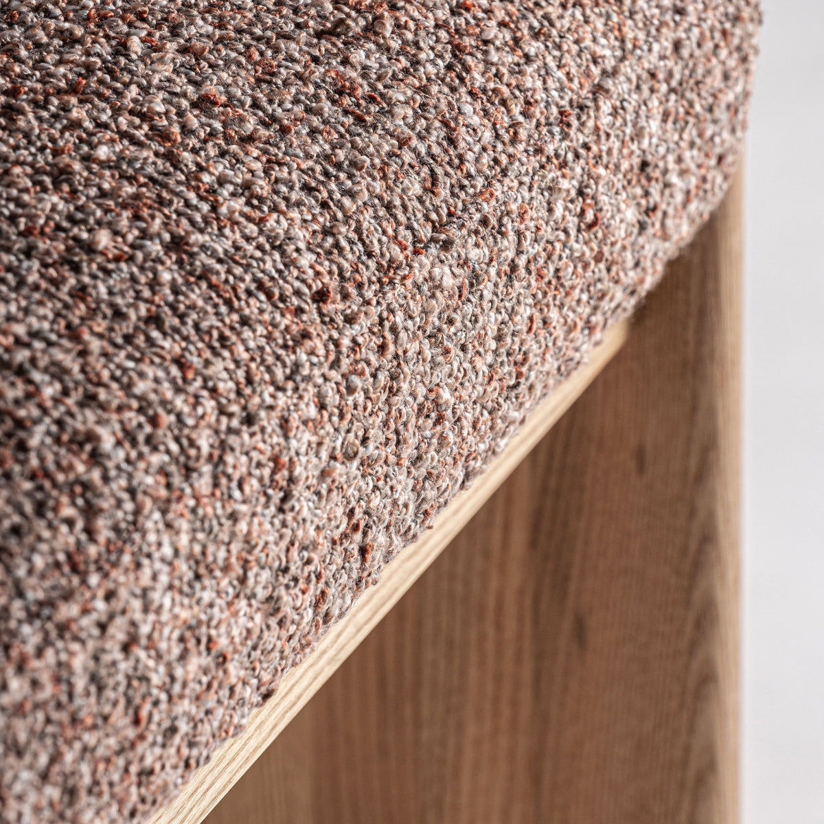 Бар стол CLARA, стил съвременен, изработен от полиестер в кафяви тонове, комбиниран с кафяв дъб и златно желязо.