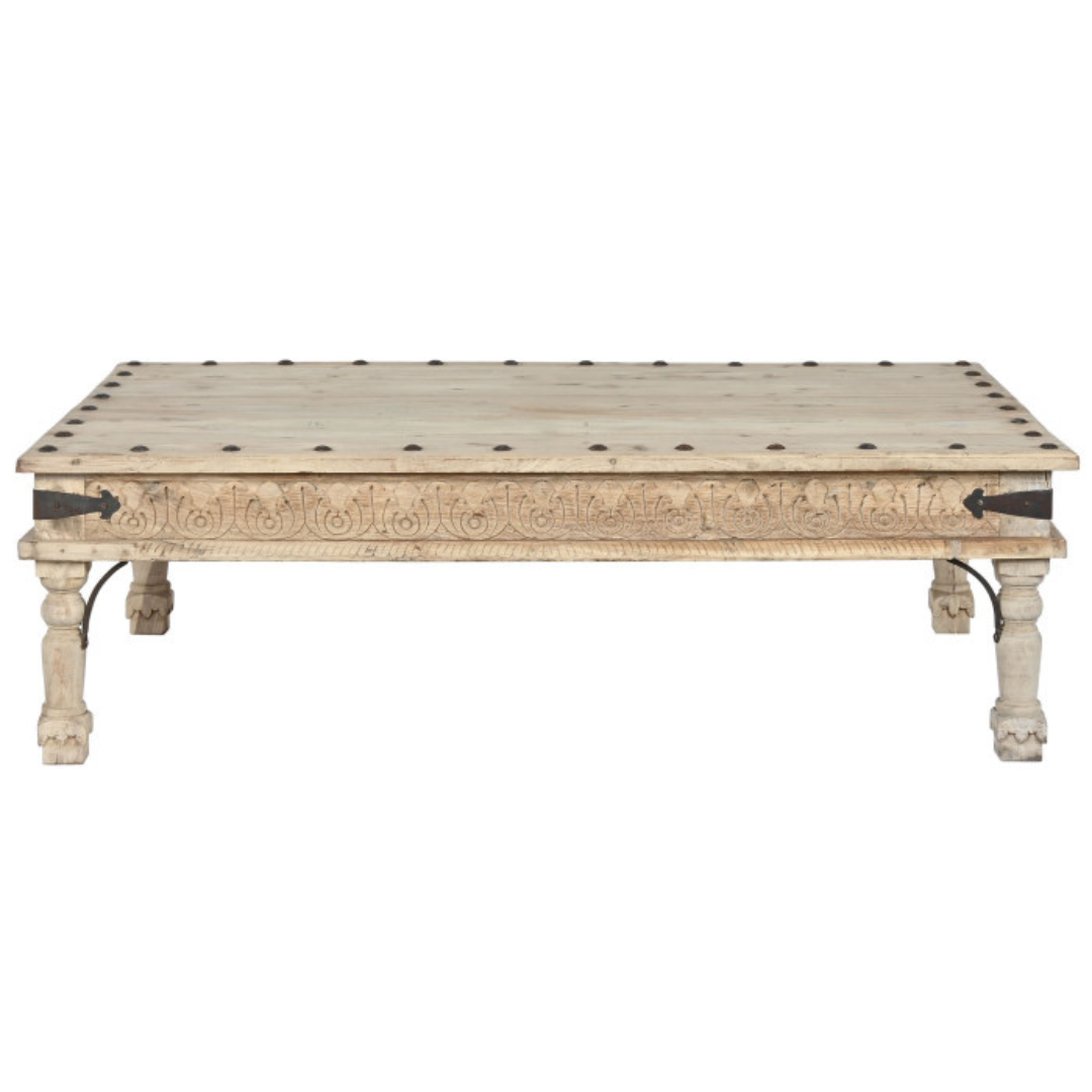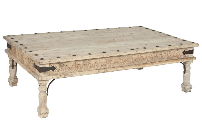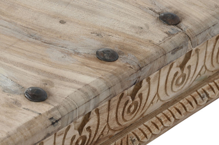 Ръчно резбована масичка за кафе от Индонезия, изработена от масивна светла дървесина с декоративни метални акценти. Рустикална централна част, която съчетава занаятчийска изработка с издръжливи материали - идеална за интериори с характер и вечна елегантност.