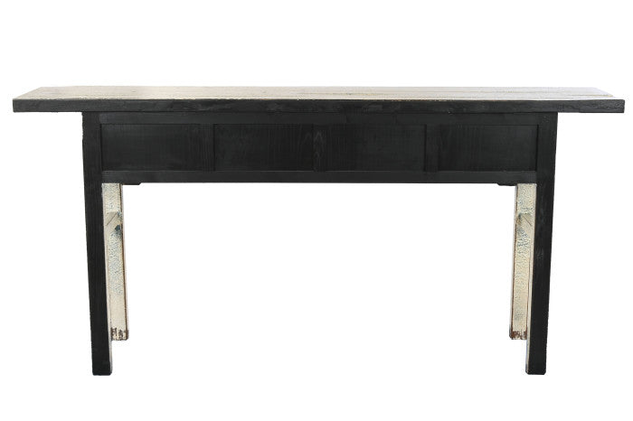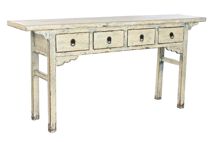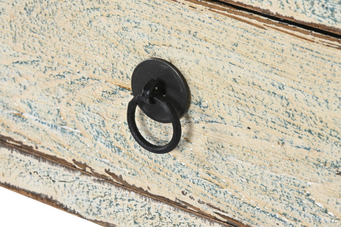 Изработена от рециклирана брястова дървесина, тази конзолна маса съчетава рустик чар с вечна елегантност. Материалното покритие, видимите шарки и фините сини акценти извикат усещане за история и майсторство. С четири практични чекмеджета и декоративни изрязани детайли, тя е едновременно функционална и изпълнена с характер.