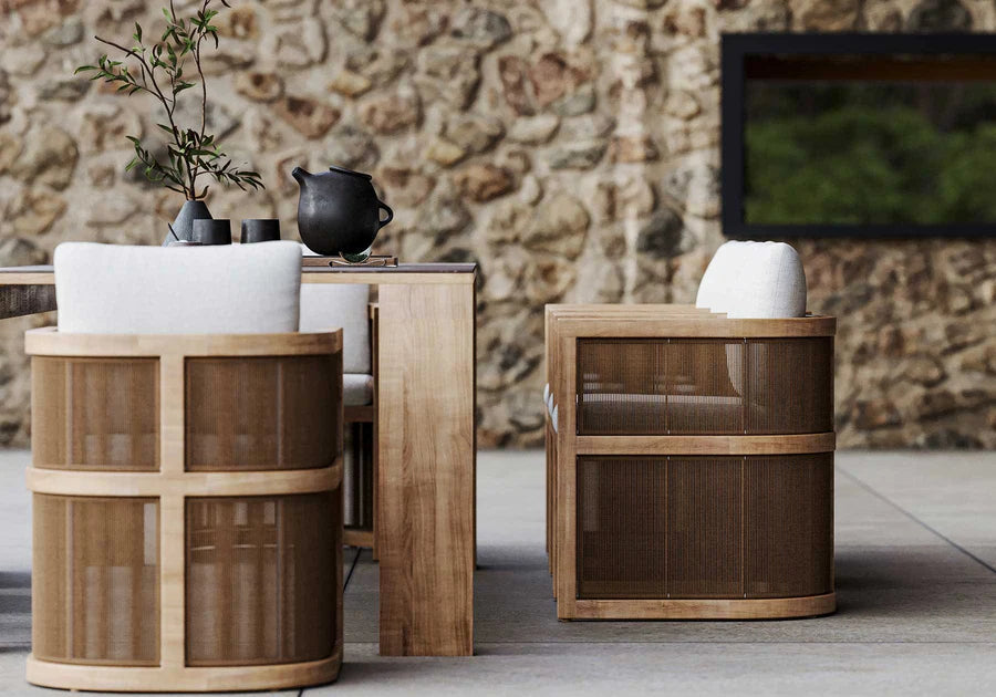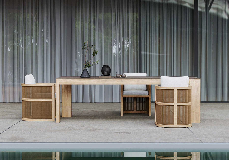 • Изработен е от устойчиво на открито тиково дърво и ракита.