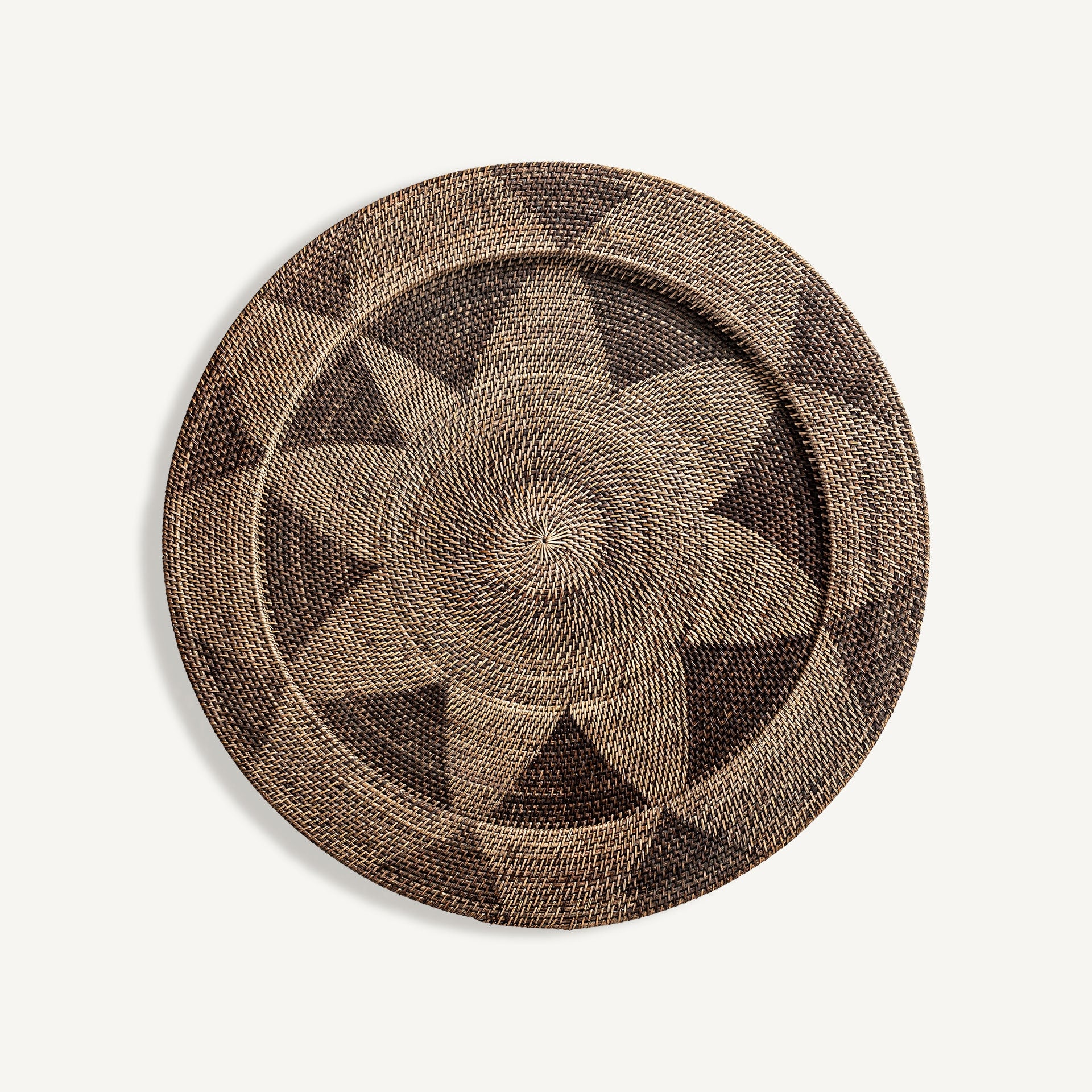 Декоративна чиния, стил бохо, изработена от ратан в кафяви тонове.