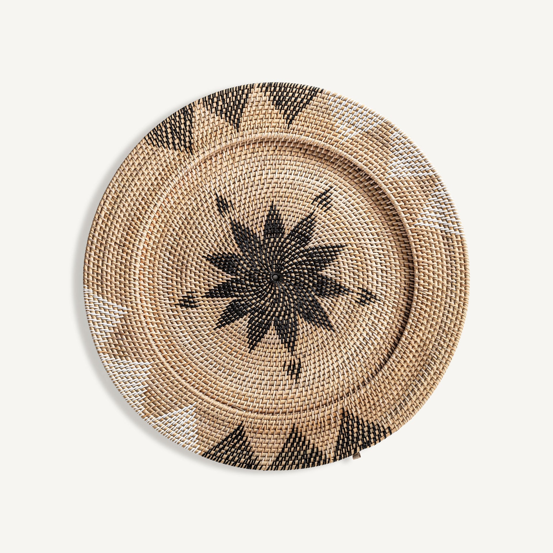 Декоративна чиния, стил бохо, изработена от ратан в кафяви тонове.
