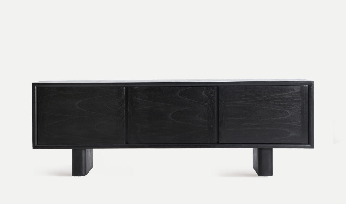 ТВ шкаф Demmin в съвременен стил, изработен от черно дърво минди. Сдържана и елегантна мебел, която съчетава функционалност с минималистичен дизайн.
