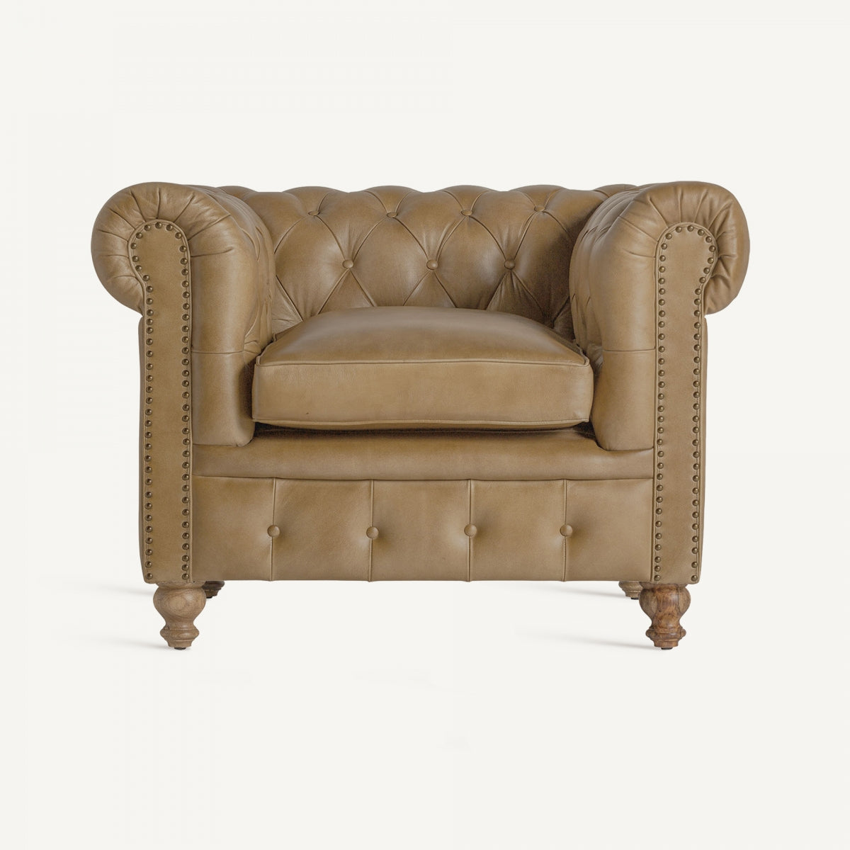 Фотьойл Elkins с копчета, стил винтидж, изработен от кожа в кафяво, комбинирана с акациево дърво. Продуктът е подвижен.