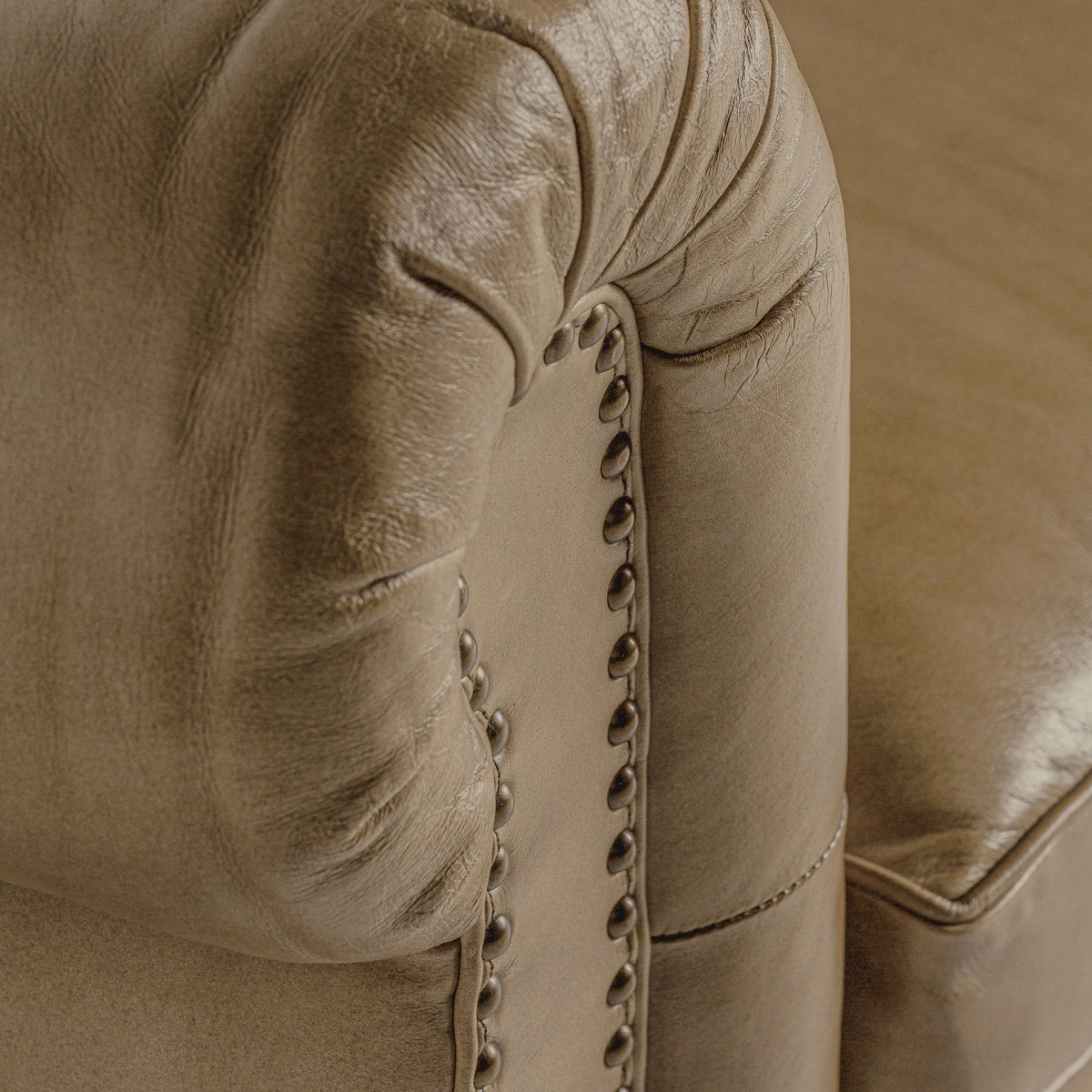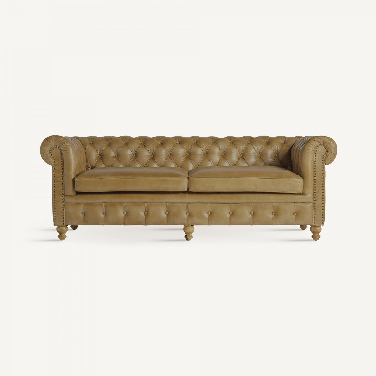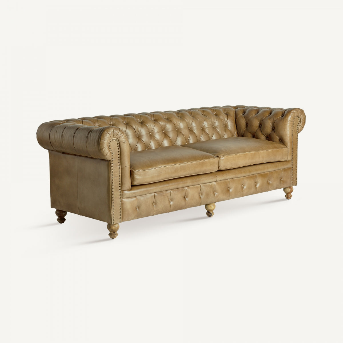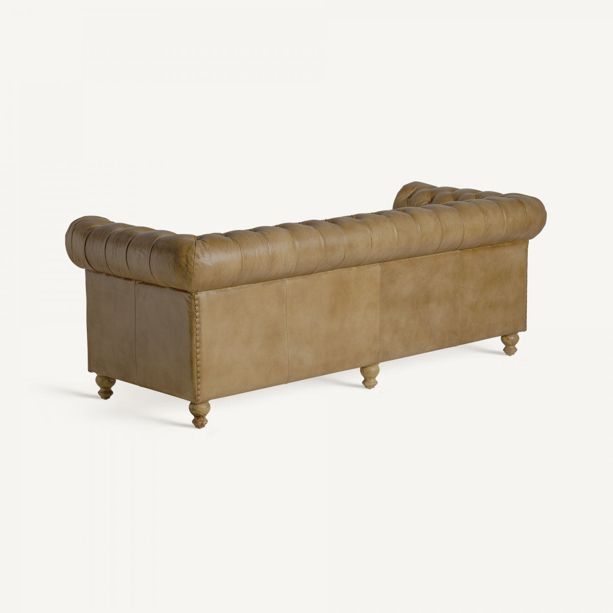 Диван Elkins с копчета, стил винтидж, изработен от кожа в кафяво, комбинирана с борова дървесина. Продуктът е подвижен.