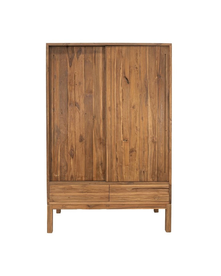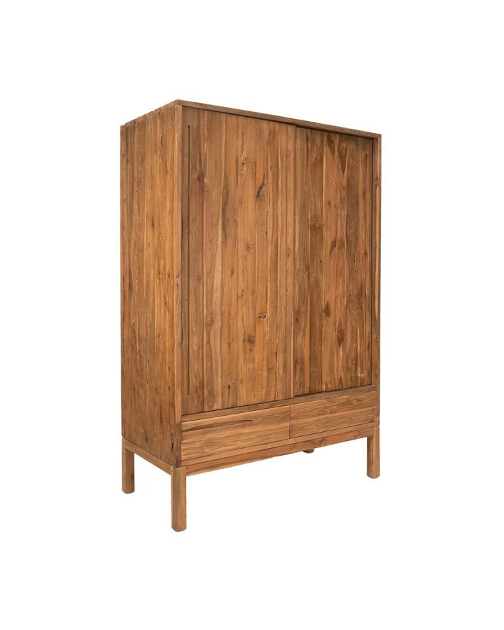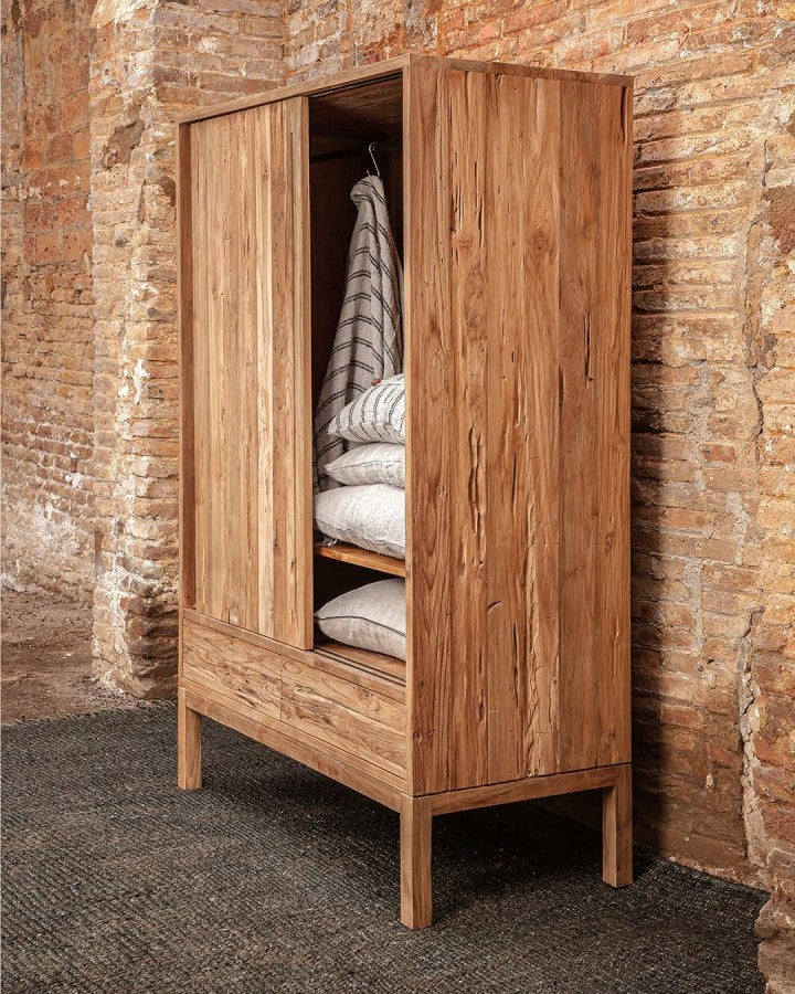 • Истински автентичен декоративен стил е това, с което най-много може да се похвали шкафът EROSI 125 Nat. Шкаф, изработен от естествено рециклирано тиково дърво, с рустик стил и страхотно присъствие. С две големи врати и вътрешен рафт, както и две функционални чекмеджета и свободно място в долната част, благодарение на повдигането на гардероба на 4 крака, също в стил рустик. Ексклузивно парче от семейството на EROSI, характеризиращо се с използването на благородни и устойчиви материали, украсени с безпогрешните белези на ерозията на времето. Гардероб от масивно тиково дърво, възстановен от стари неизползвани сгради в Ява, Индонезия, което му придава тази автентична индивидуалност, въпреки простотата на неговия дизайн. Гъвкав, функционален и естетически зашеметяващ, идеален за спални в рустик, ретро или традиционен стил.