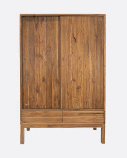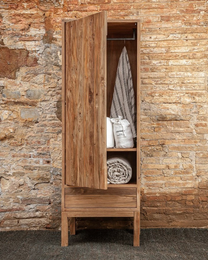 Гардеробът EROSI 65 Nat се отличава с истински автентичен декоративен стил. Тесен гардероб, изработен от естествено рециклирано тиково дърво, с рустик стил и страхотно присъствие. С широка врата, чекмедже и свободно пространство в долната част, благодарение на факта, че гардеробът е повдигнат на 4 крака, също в рустик стил. Ексклузивна мебел от семейството EROSI, характеризираща се с използването на благородни и устойчиви материали, украсени с безпогрешните следи от ерозията на времето. Масивният гардероб от тиково дърво, възстановен от стари изоставени сгради в Ява, Индонезия, му придава автентична индивидуалност, въпреки простотата на дизайна си. Универсален, функционален и естетически зашеметяващ, идеален за спални в рустик, винтидж или традиционен стил.