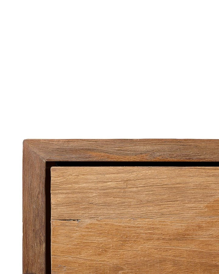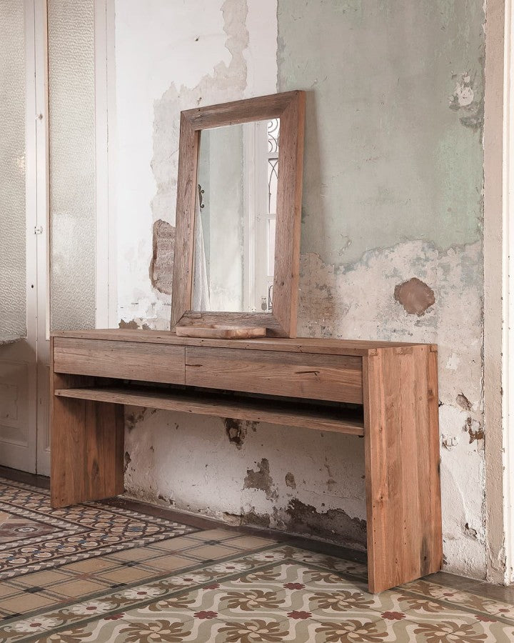 Тази уникална дървена конзола се отличава със своя характер и елегантност. Със здрав корпус, изработен изцяло от естествено регенерирано тиково дърво, с ерозирано покритие и зачитане на оригиналния цвят на дървото, тази модерна мебел с класически нотки е задължителна за тези, които обичат вечния дизайн. Конструкция, която съчетава естетика и функционалност, с две големи чекмеджета, за да можете да съхранявате всичко необходимо и да поддържате дома или офиса си организиран. EROSI 120, изработен от устойчиво регенерирано дърво от стари изоставени сгради в Ява (Индонезия) има всичко, за да се превърне в новата любима мебел във вашата всекидневна, коридор или коридор. Перфектен за придаване на органичен и винтидж щрих на всеки стил на домашен декор - и много лесен за комбиниране с други дървени мебели и естествени текстури