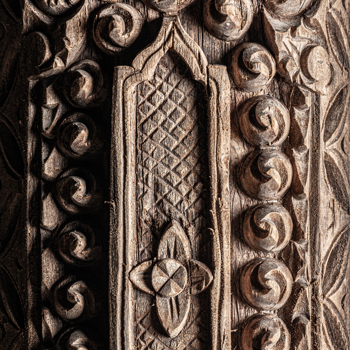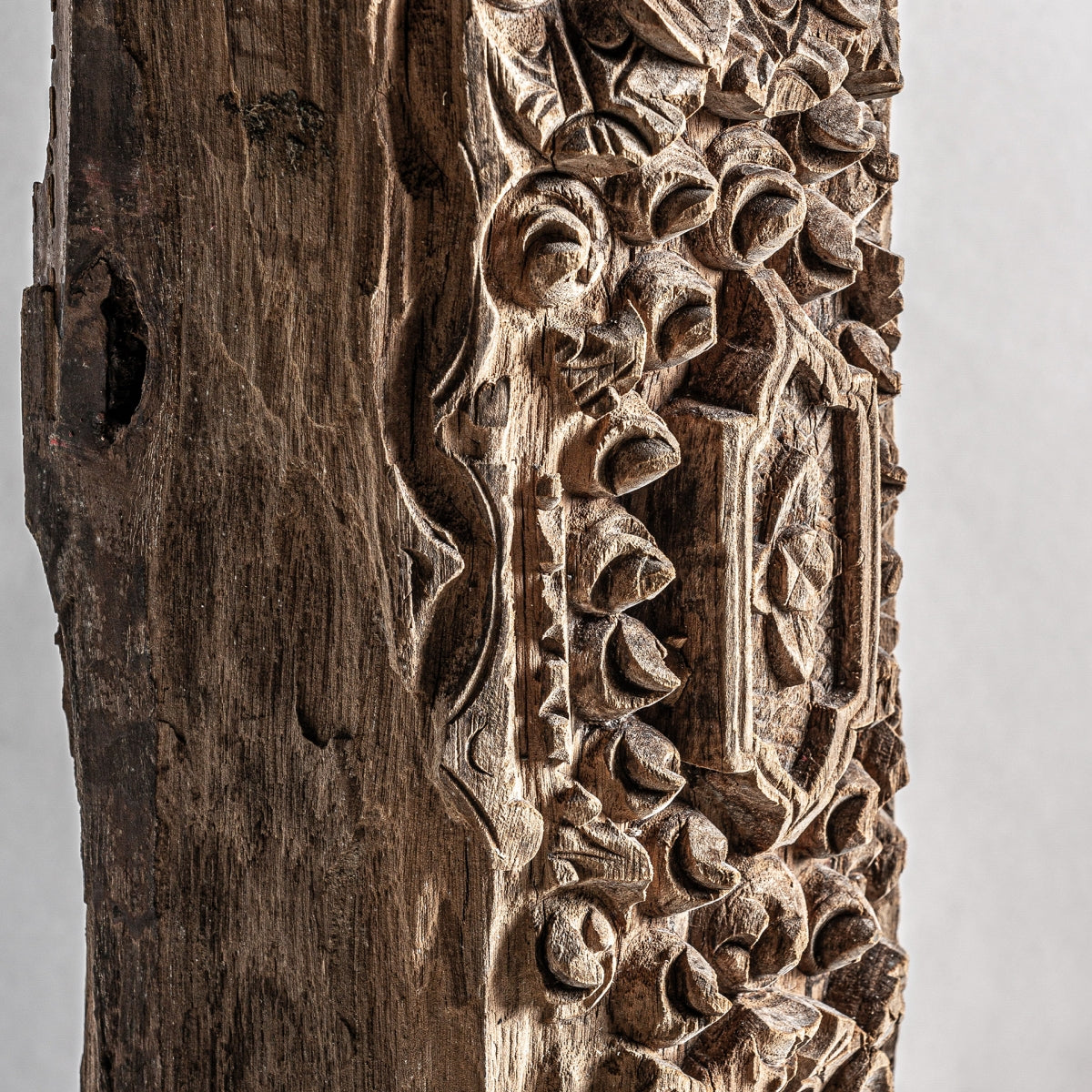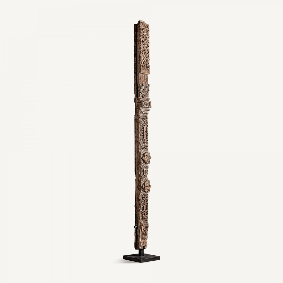 Подова скулптура, изработена от тиково дърво в кафяво, комбинирано с черно желязо.