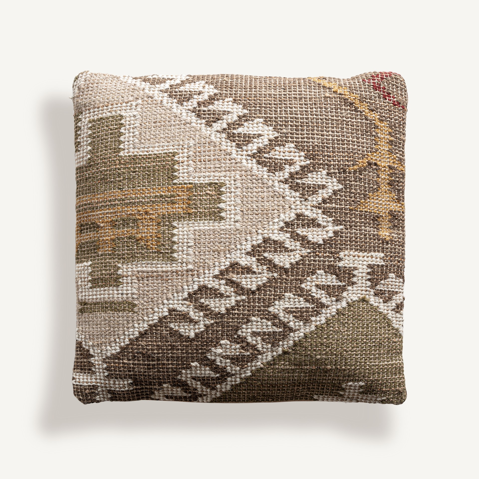 Традиция и текстура в перфектна хармония. Възглавницата Glaeke, в етнически стил, е изработена от щампован кафяв памук и е комбинирана с юта. Мебел, която внася топлина и култура във всяко пространство.