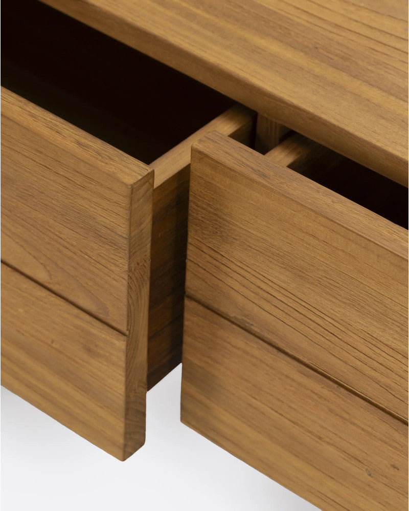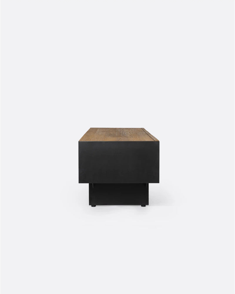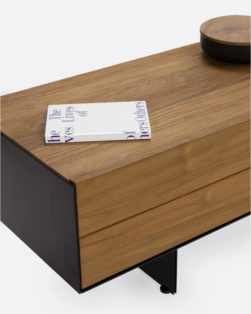 - Този ТВ шкаф е част от емблематичното, индустриално повлияно семейство GEOX. Серия, която умело съчетава топлината на рециклирания тик с изтънчеността на черно боядисан метал. Гениалният дизайн на конструкцията е създаден от тънък лист желязо, който обгръща дървото като метална кожа, оставяйки само красивите естествени шарки на тиковите фронтове на чекмеджетата и плота открити. Предлаган в различни размери и конфигурации на врати и чекмеджета, този шкаф се адаптира към различни пространства и нужди със стил и гъвкавост.