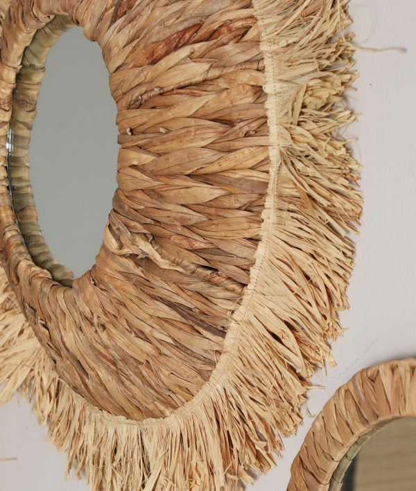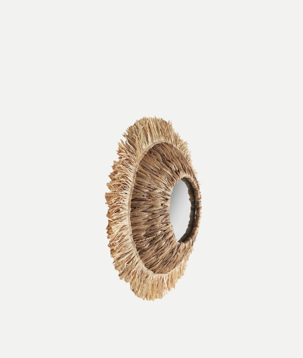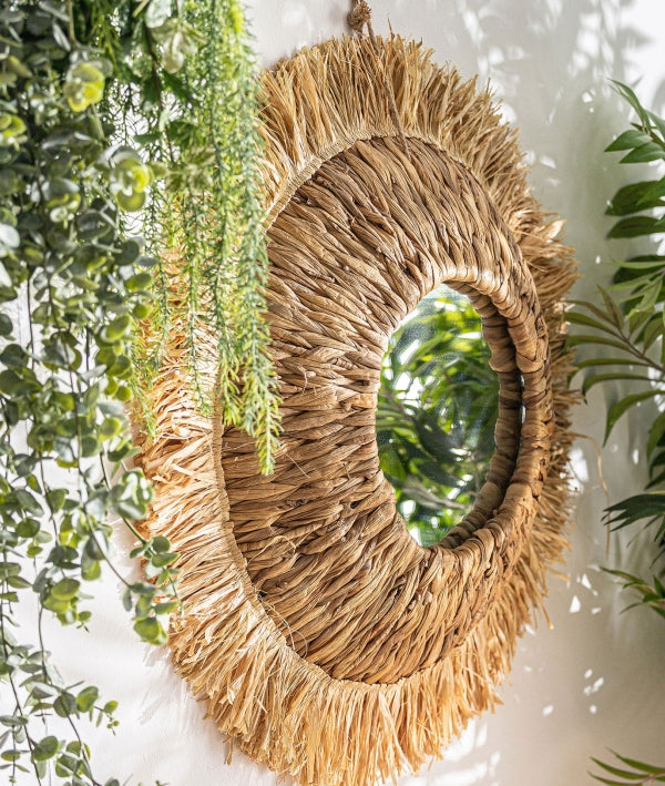 С кафява рамка, оплетена с въжета, върху метална конструкция, огледалото Kasses е чиста бохемска същност. Идеално като фокусна точка в пространства, които ценят автентичността и майсторската изработка.