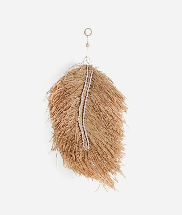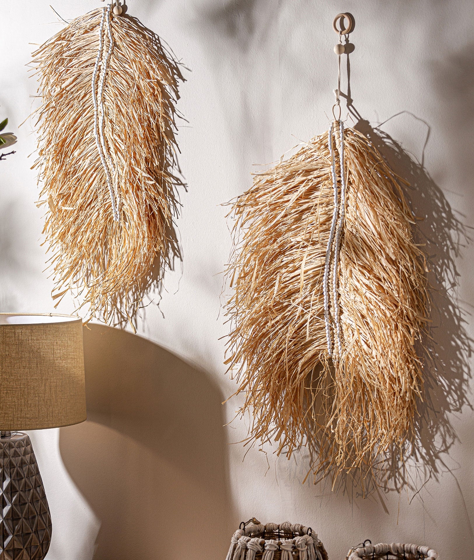 Стенно изкуство с неправилна форма Kasses, стил бохо, изработено от рафия в кафяво.