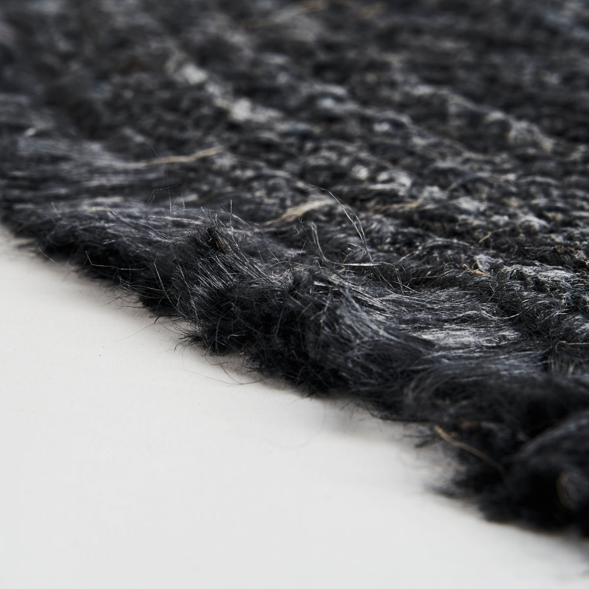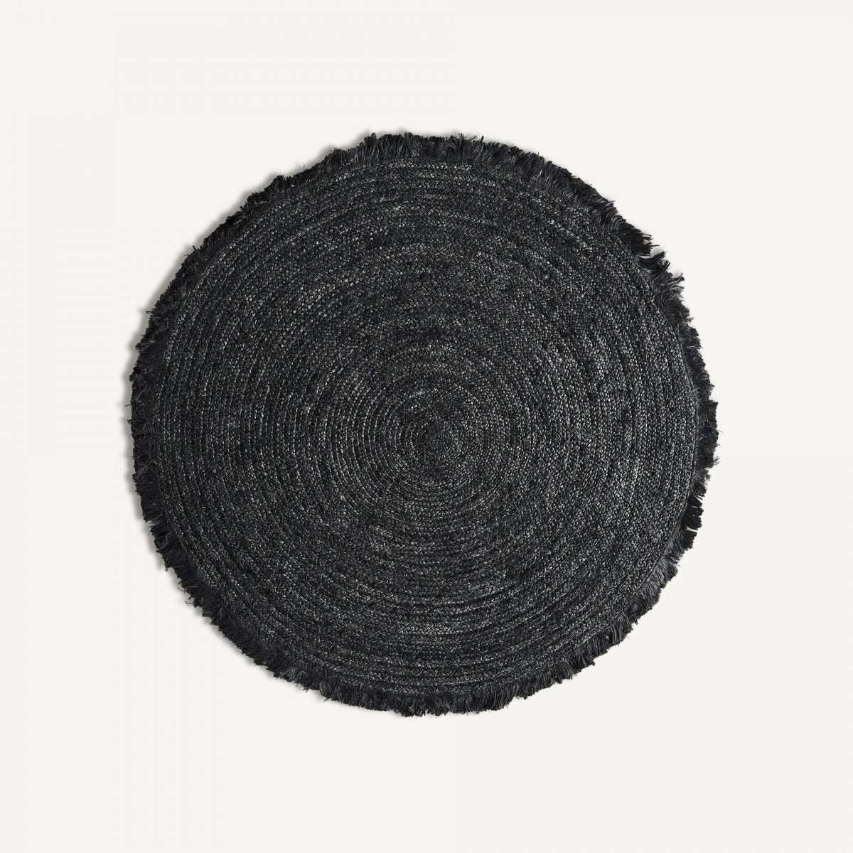Килим кръгъл кисай, стил съвременен, изработен от юта в черно с боядисано покритие.