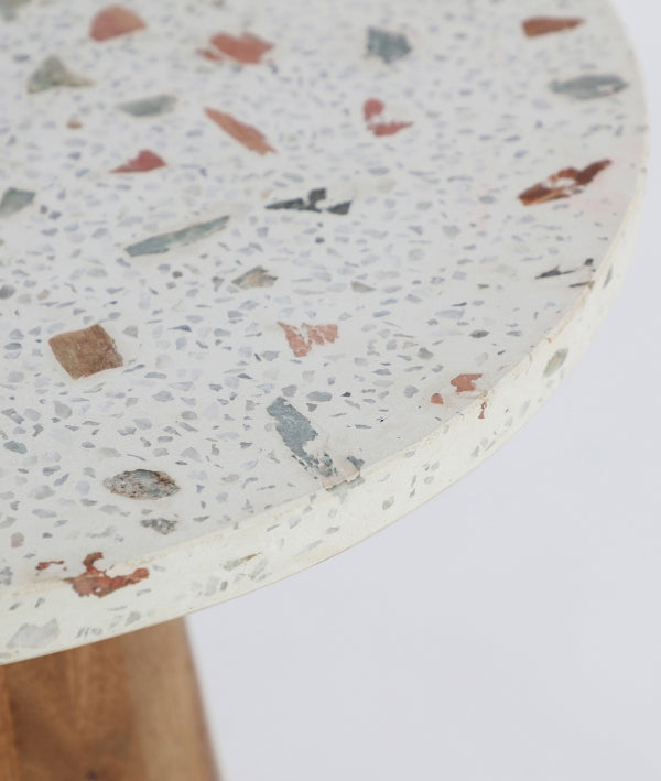 Страничната масичка Lautrec от KODU преосмисля простотата на скандинавския стил. Тя съчетава бяло терацо с топлината на манговото дърво, създавайки повърхност, изпълнена с текстура и индивидуалност. Перфектна е като странична масичка или за подчертаване на любима лампа или растение.