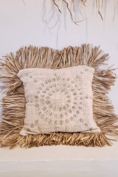 Красива възглавница от груб лен с ресни от рафия и декорирана с красиви черупки от каури. Съвсем плажен! Съвпада идеално с нашите красиви ленени карета с ресни от рафия.