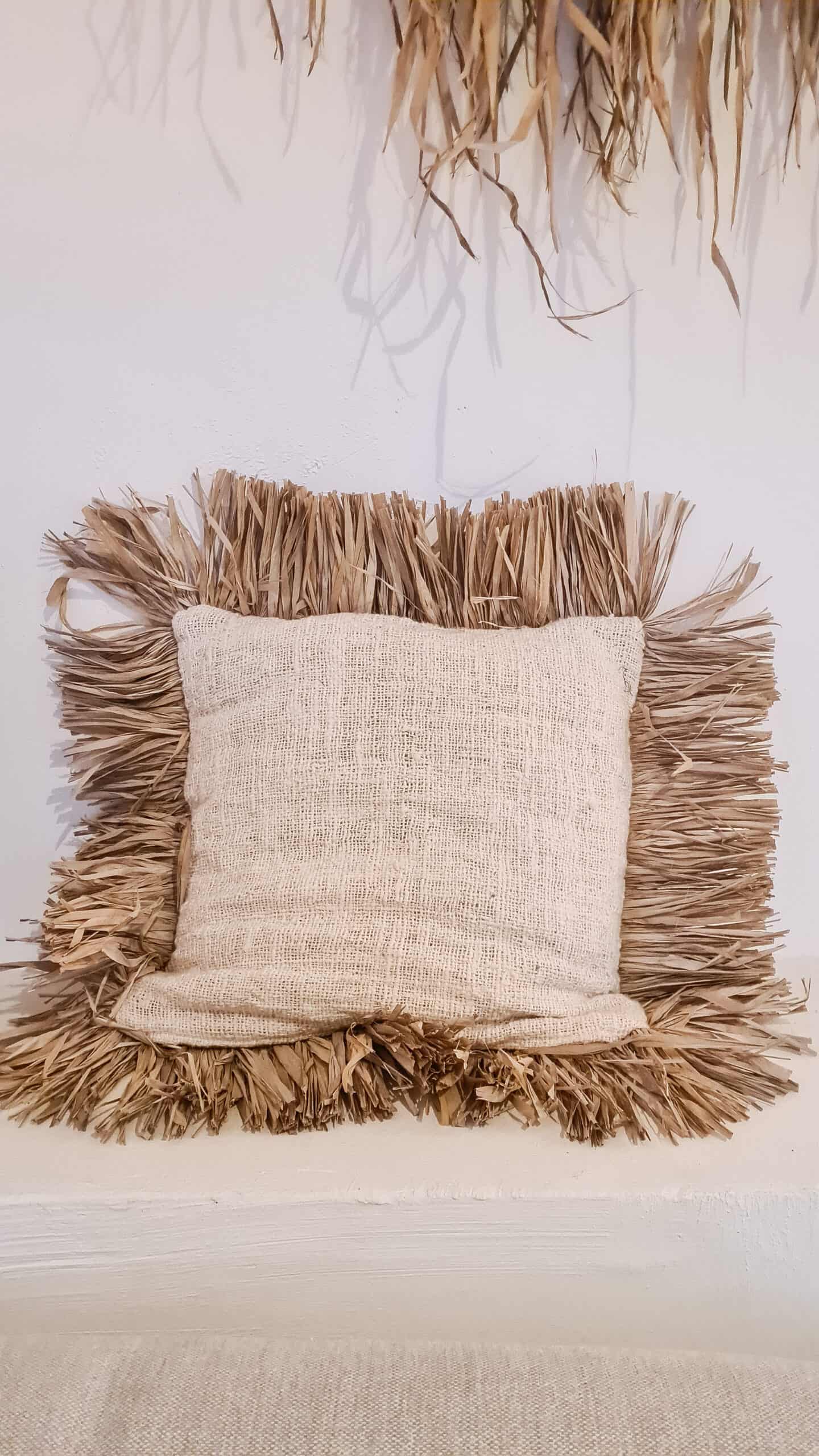 Красива възглавница от груб лен с ресни от рафия. Съвсем плажен! Съвпада идеално с нашите красиви ленени карета с ресни от рафия.