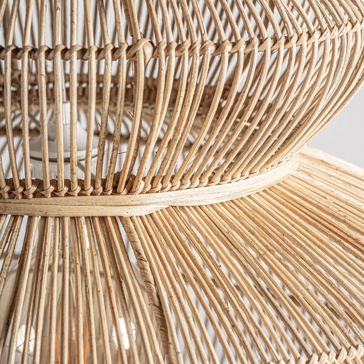 Таванна лампа, стил бохо, изработена от ратан в кафяво.