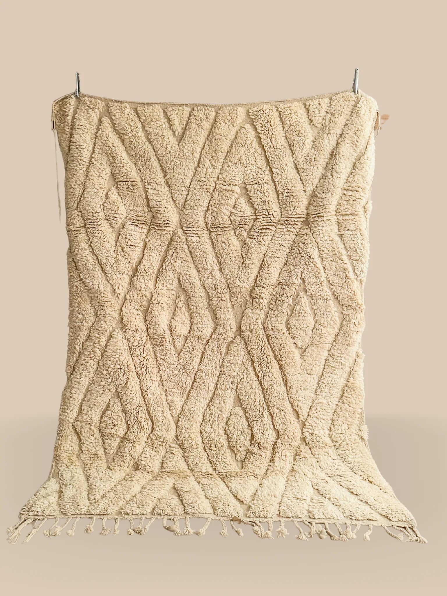 Внесете топлина и автентичност във вашия интериор с този ръчно тъкан килим Beni Ouarain (300x200 см). Изработен от берберски жени от Атласките планини в Мароко и изработен от 100% чиста вълна. Всеки килим е уникален и отразява чистия занаятчийски талант на берберската култура.