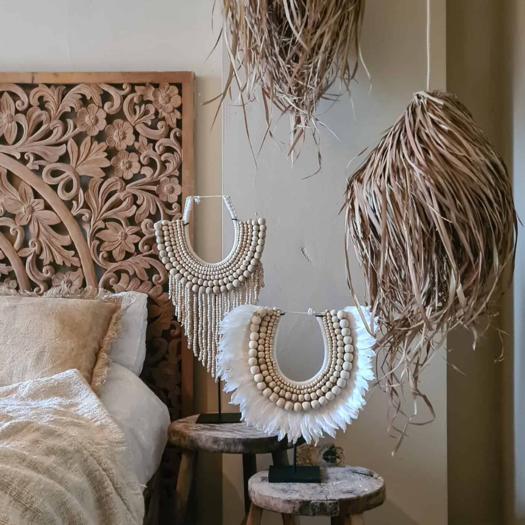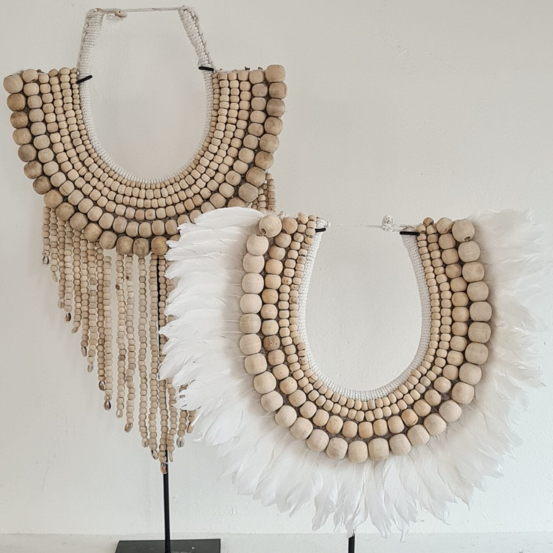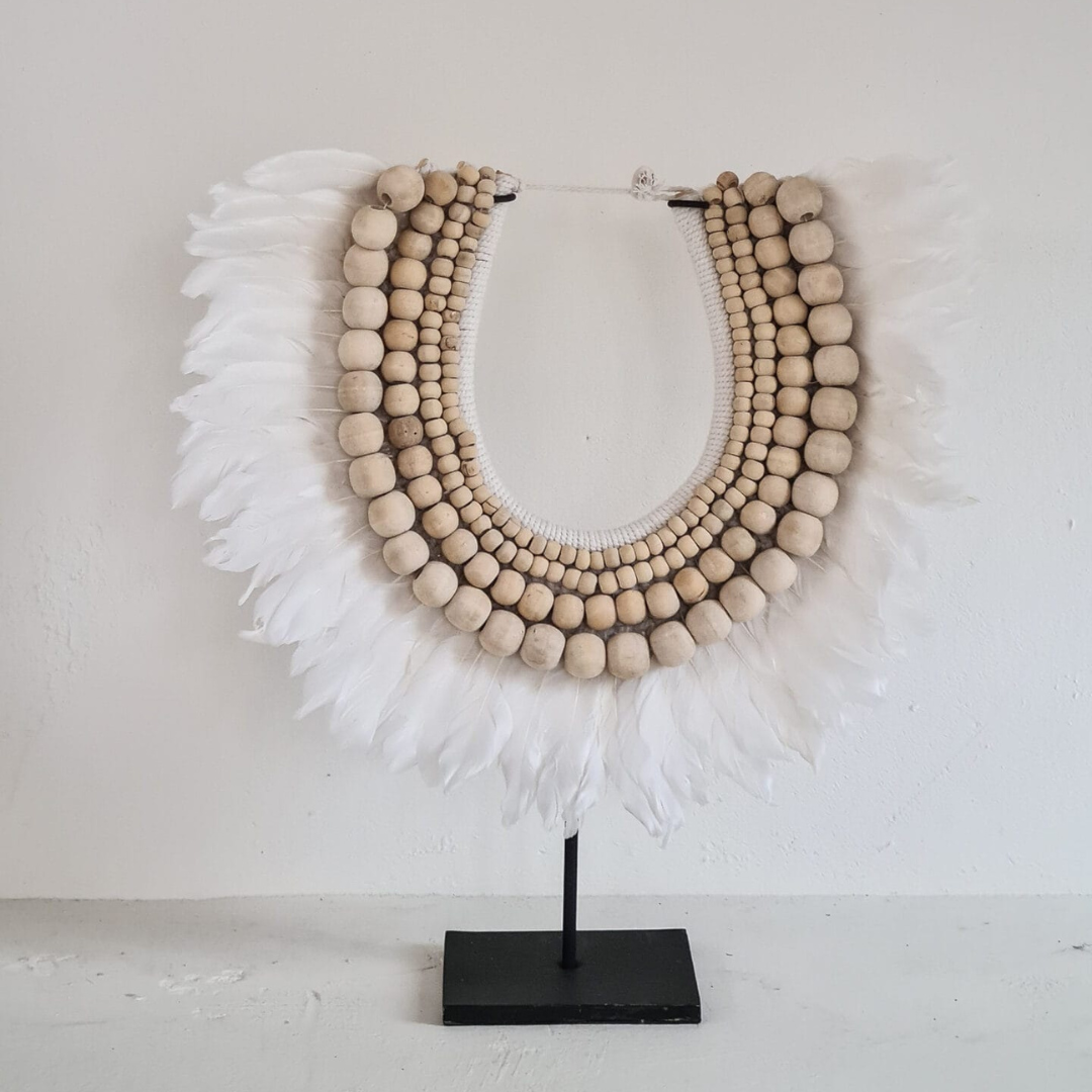 Бели пера и дървени мъниста. Толкова красива комбинация! Дори екзотично! Красива ръчна изработка в Бали