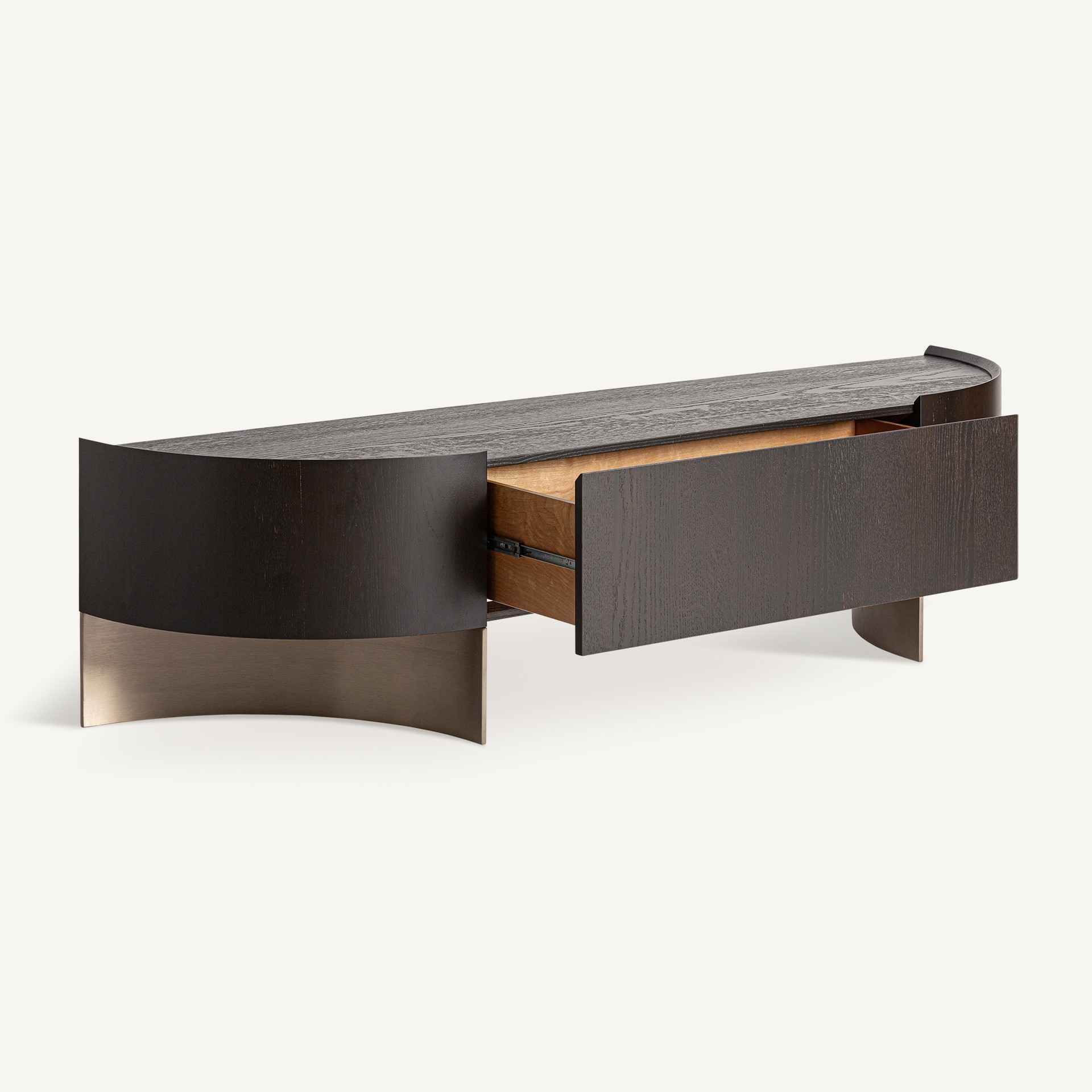 Тозият дизайн на VICAL внася баланс и стил: телевизионният шкаф Neuvic. Неговият кафяв дъбов фурнир и златна стоманена конструкция съчетават функционалност с изискана и съвременна естетика.