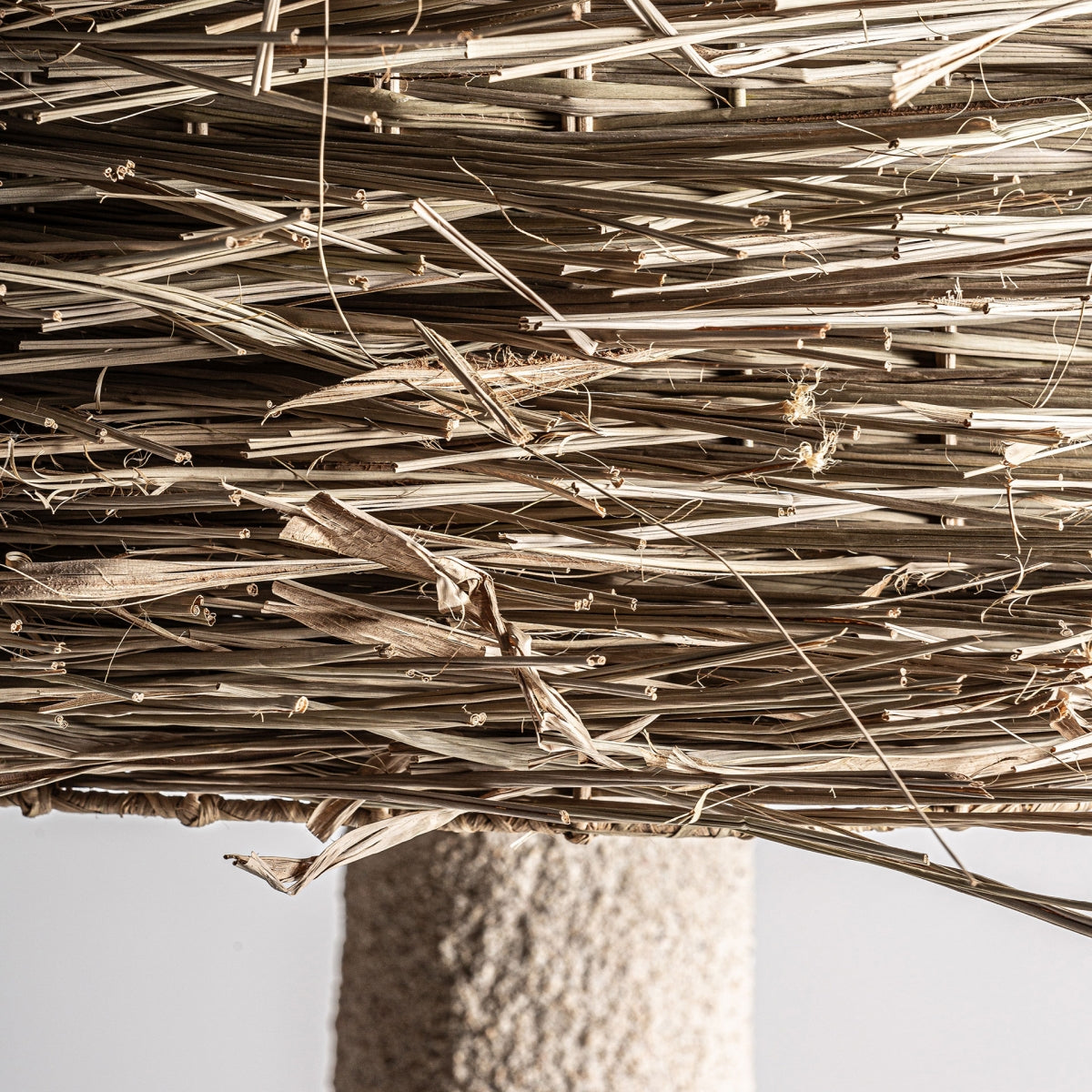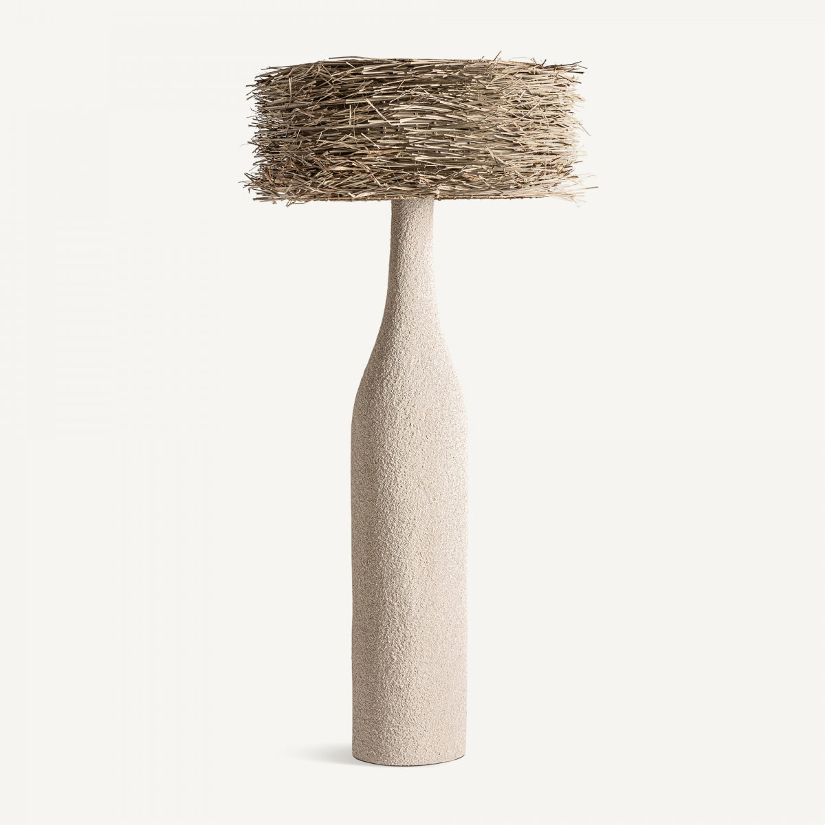 Подова лампа Niland, стил рустик, изработена от смола в кремав цвят с груб завършек, комбинирана с кафява морска трева. Продуктът е подвижен.