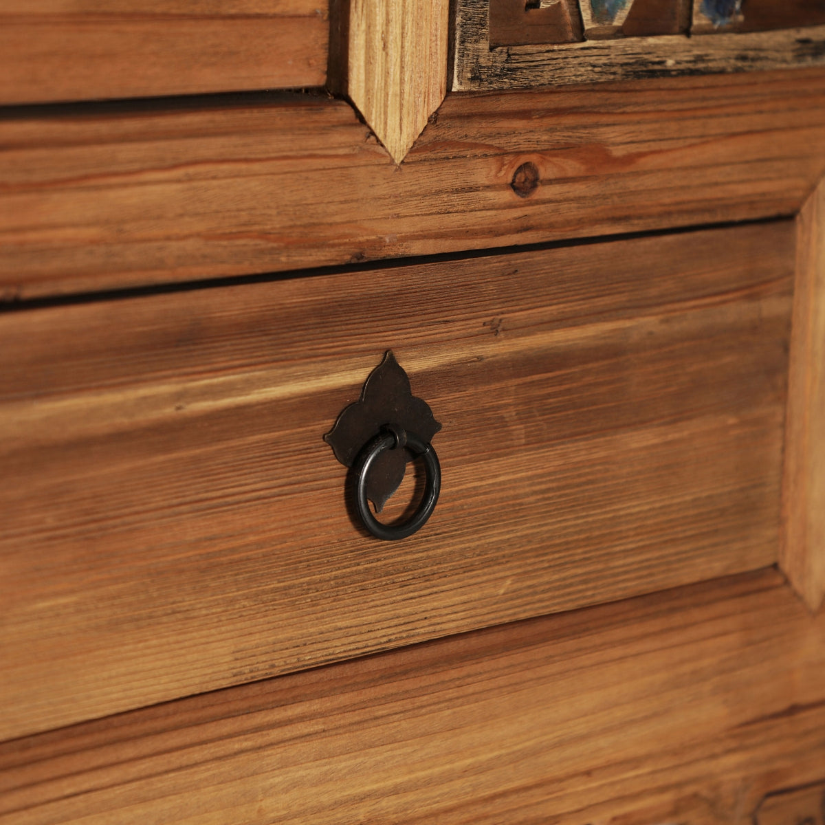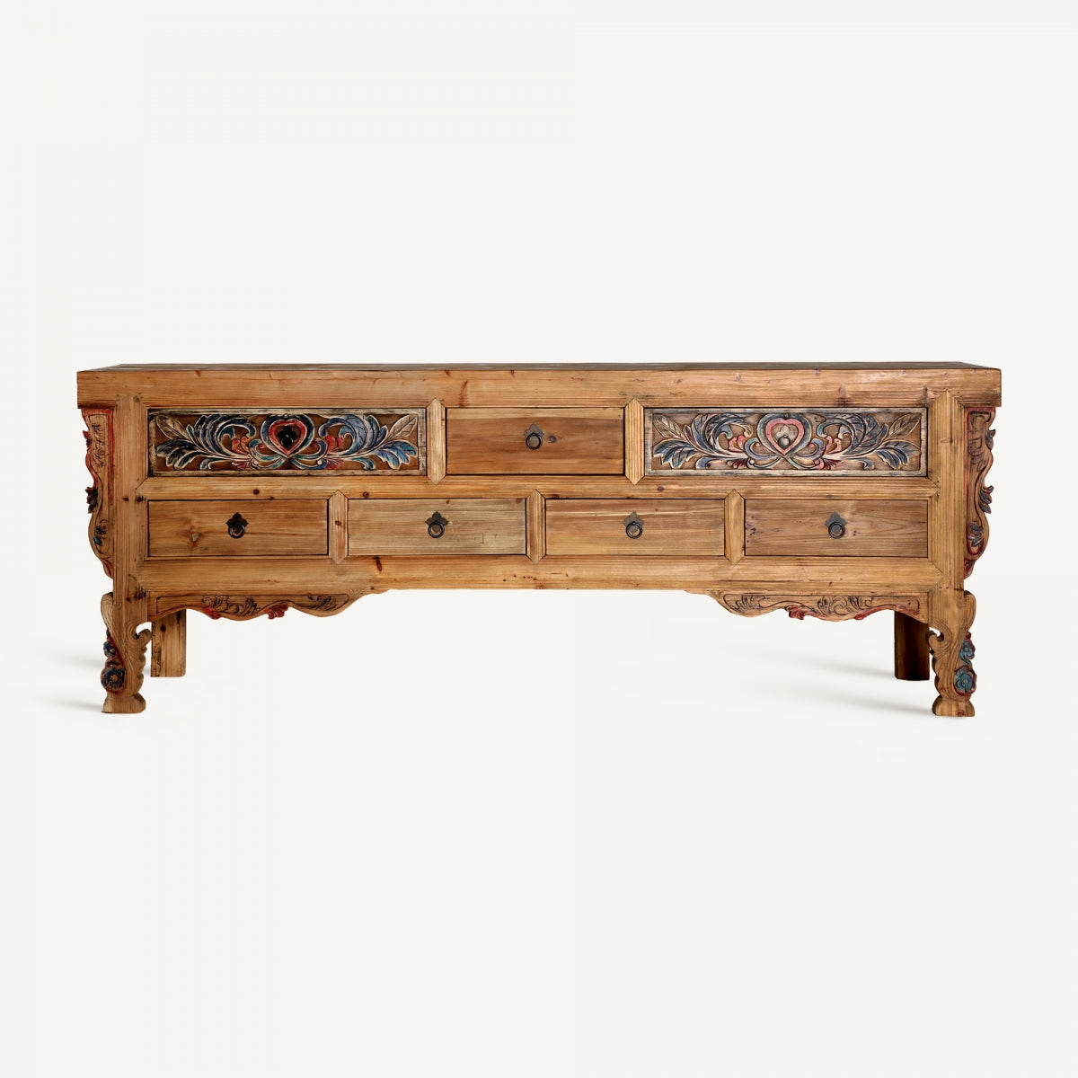 Този изключителен бюфет е смесица от изкуство и устойчив дизайн. Ръчно изработен от регенерирано дърво, той отразява духа на ориенталската естетика с красиво издълбани и ръчно рисувани мотиви. Всеки детайл разказва история – от флоралните шарки по чекмеджетата до елегантно извитите крака, украсени в ярки цветове.
