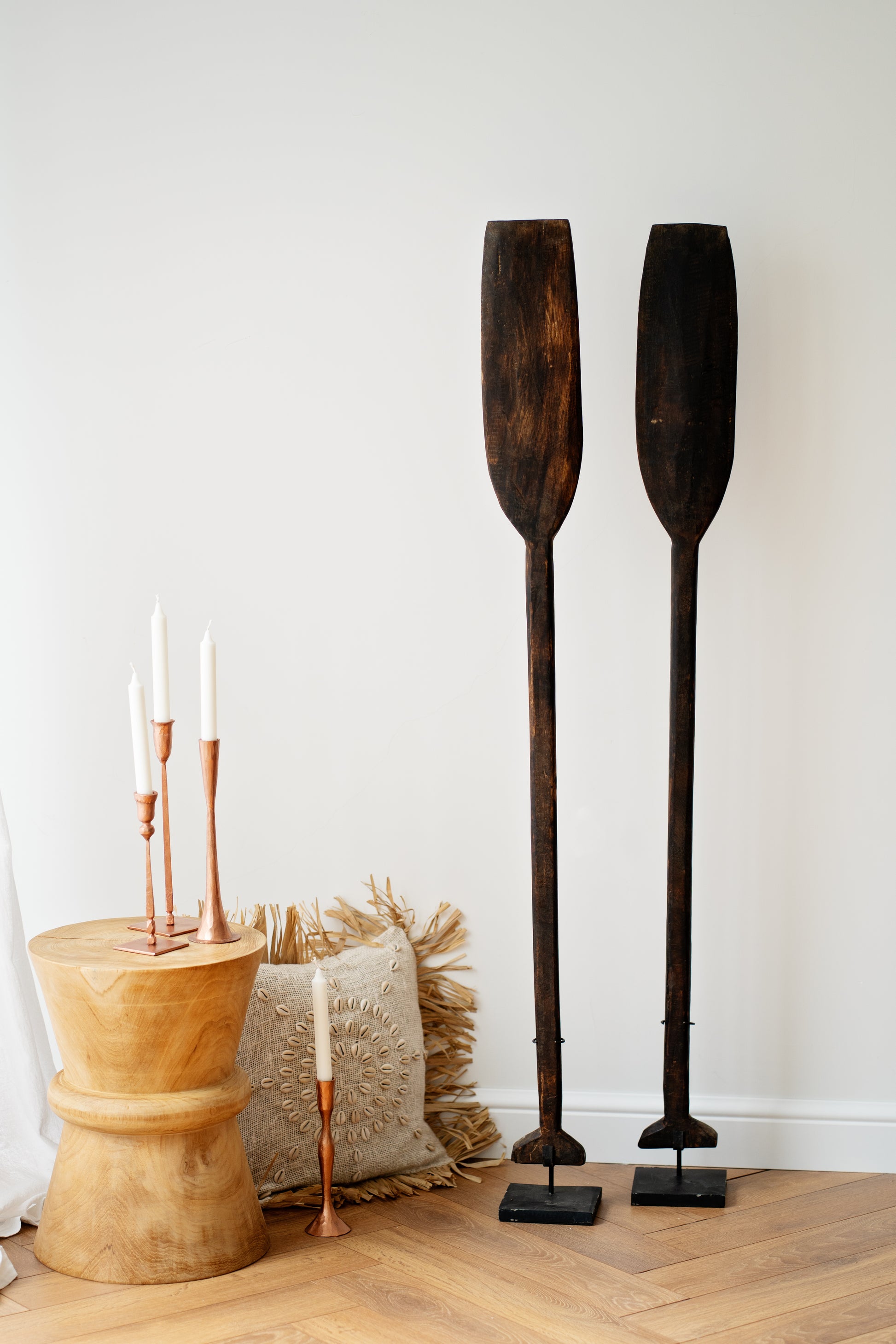 Всяко гребло има автентично състарен вид, постигнат чрез специална обработка, която подчертава неговата история и отличителен винтидж стил. Греблата са изработени от дърво и се доставят с метална стойка. Те са впечатляващ акцент за интериори в крайбрежен, бохо или рустик стил. Перфектен избор за декориране на ресторанти, барове, хотели или домове, вдъхновени от морската естетика!