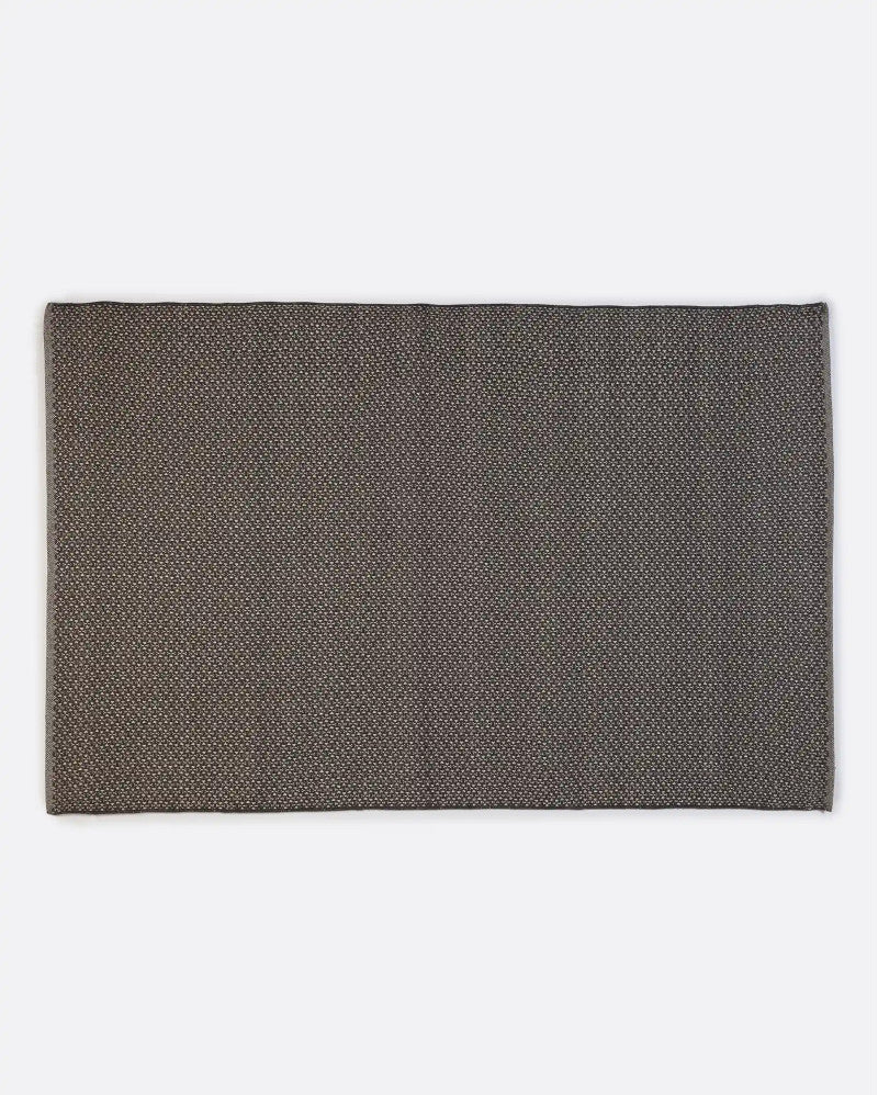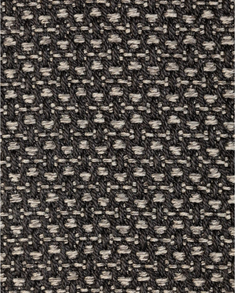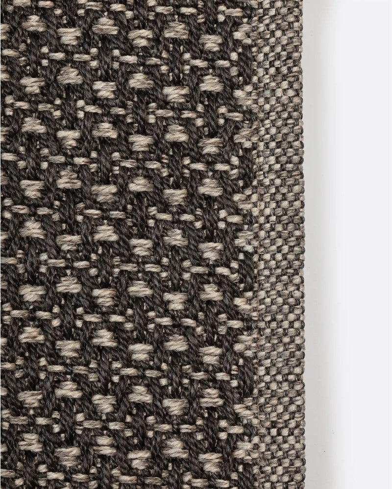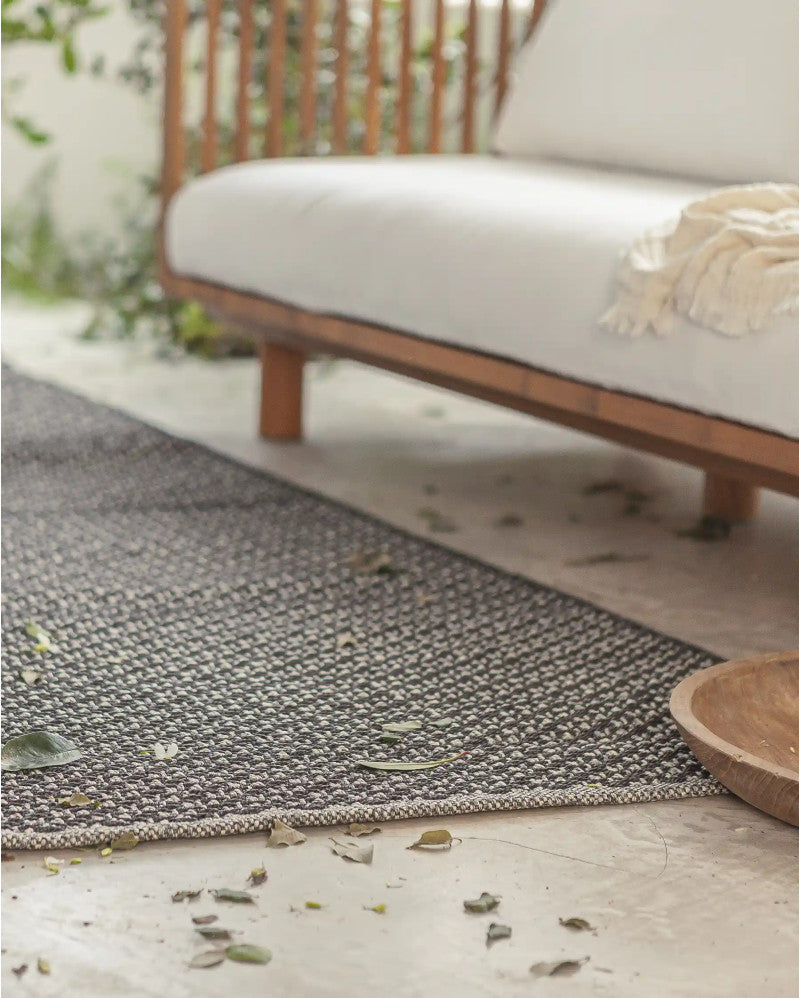 Килим KALAPET за вътрешна и външна употреба, ръчно тъкан от 100% полипропилен, лесно за поддръжка синтетично влакно с отлична устойчивост на износване, вода, мухъл и слънчева светлина. Едноцветен черен дизайн с бели шевове. Подходящ за вътрешна и външна употреба. Предлага се в два размера.