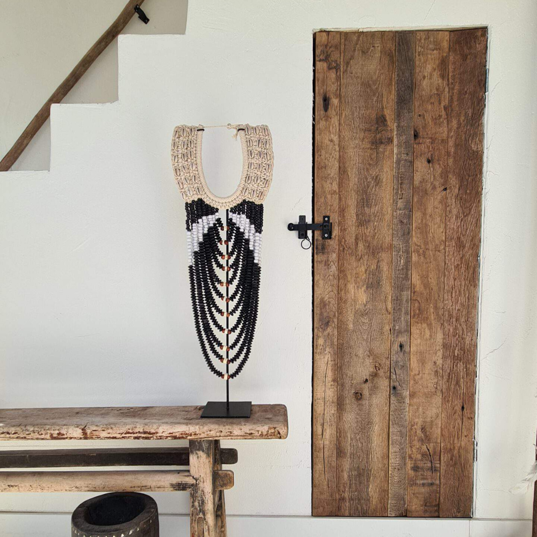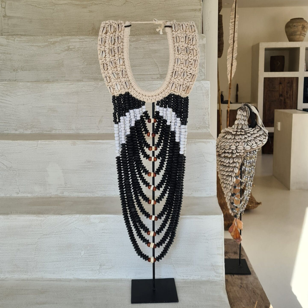 Комбинацията от миди и мъниста и съчетанието на цветовете бяло, бежово, кафяво и черно прави това колие чудесно за комбиниране с други украшения. Ето защо тя се вписва и в различни видове интериорни стилове. Красив привличащ вниманието!