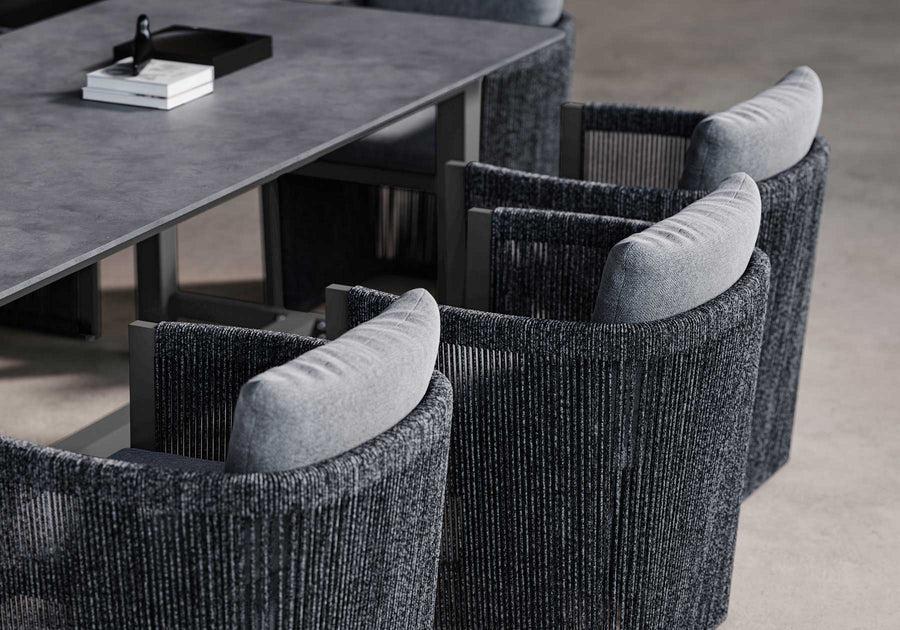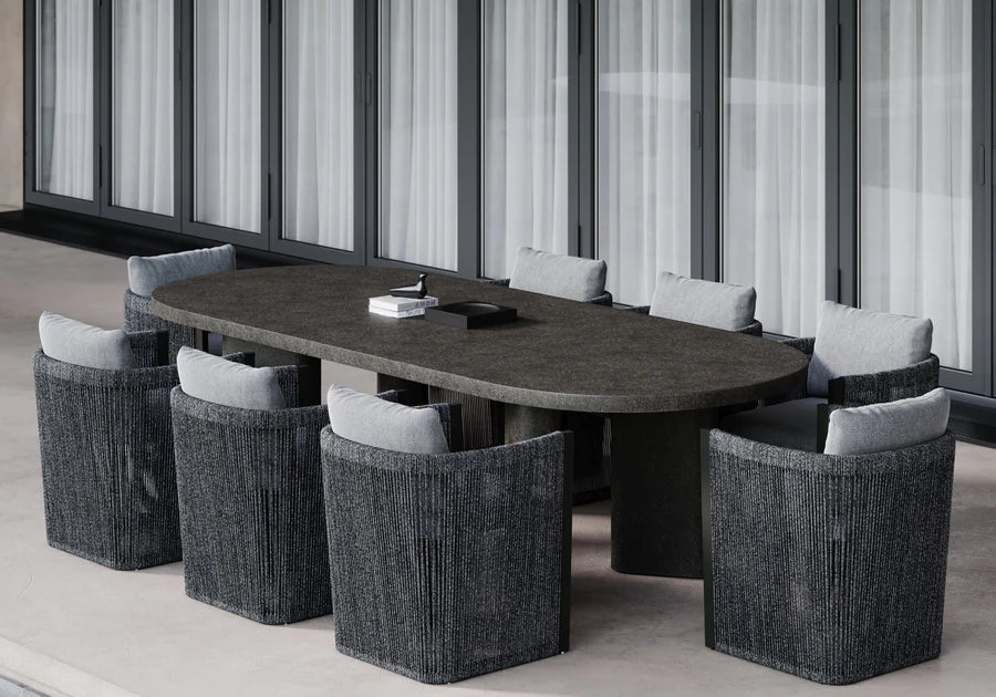 - Комплектът трапезна маса се състои от трапезна маса и осем трапезни стола.