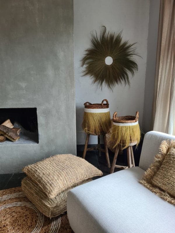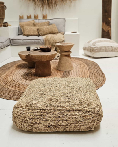 Тази възглавница за под е направена от листа от ананас. Това е същият материал като нашите кошници за спане и кръглите пуфи и възглавници от рафия. Толкова хубаво за комбиниране.