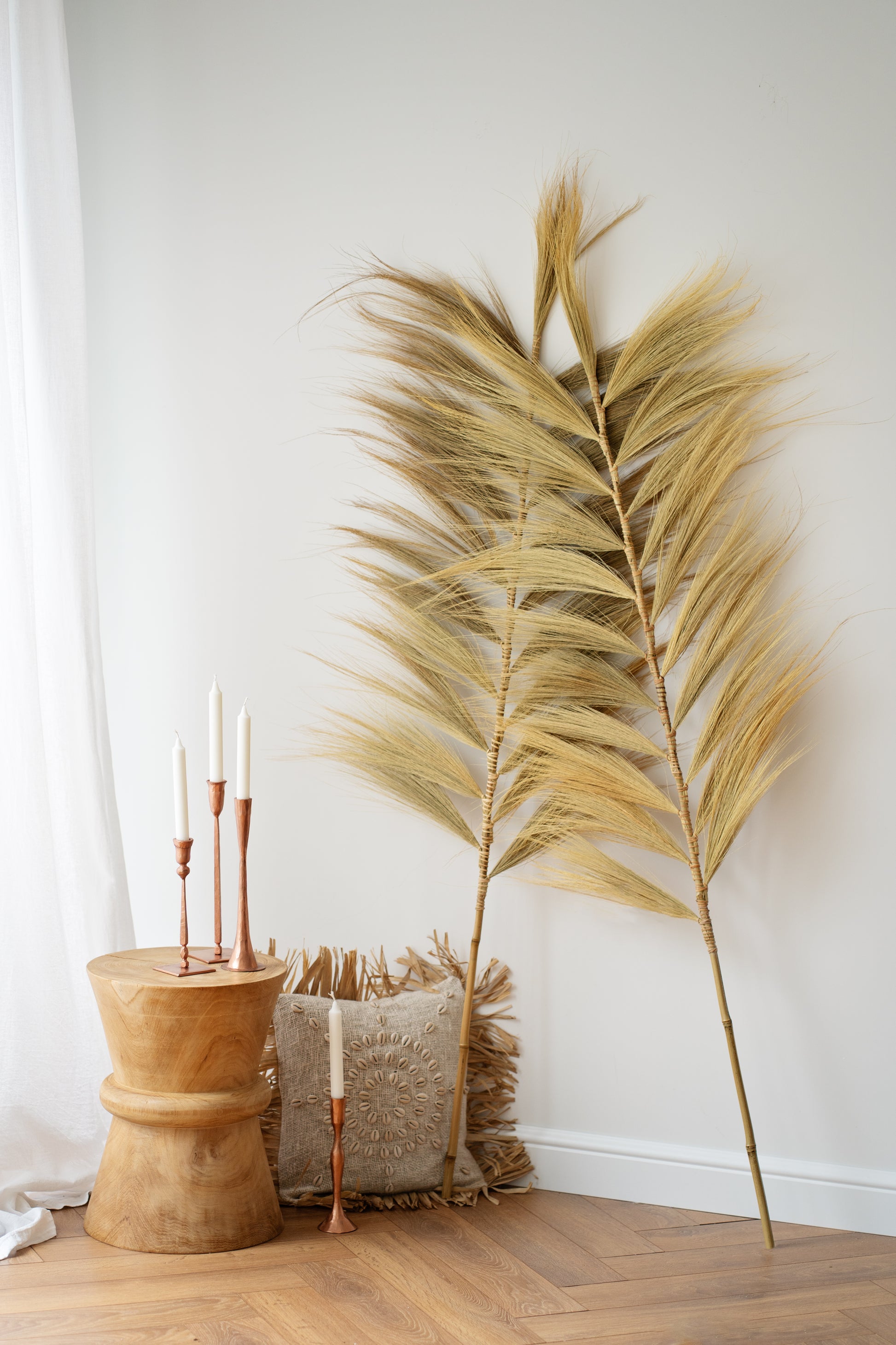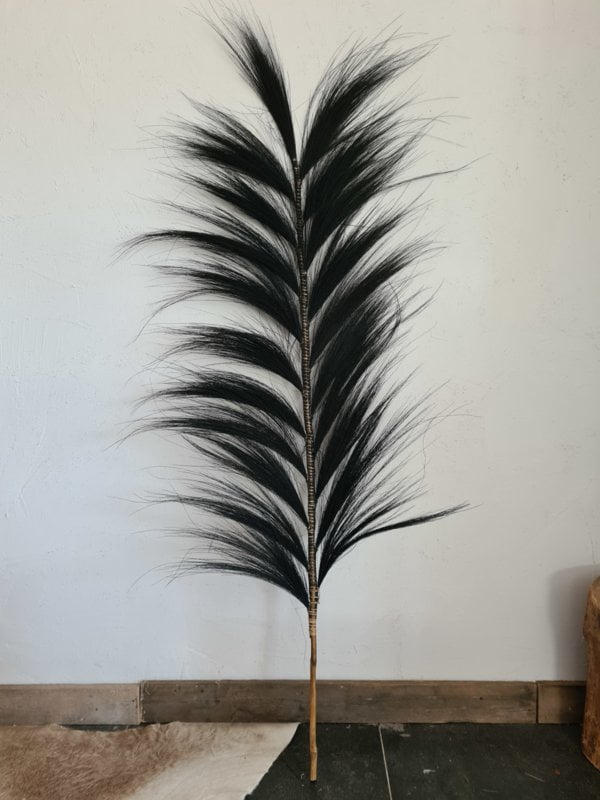Колко готини са тези? Сами по себе си привличат вниманието. Изработени са ръчно от фина трева. Красиво голямо перо върху бамбукова пръчка. Те са дълги около 160 см. Отгоре ги комбинирайте с други пера и листа.