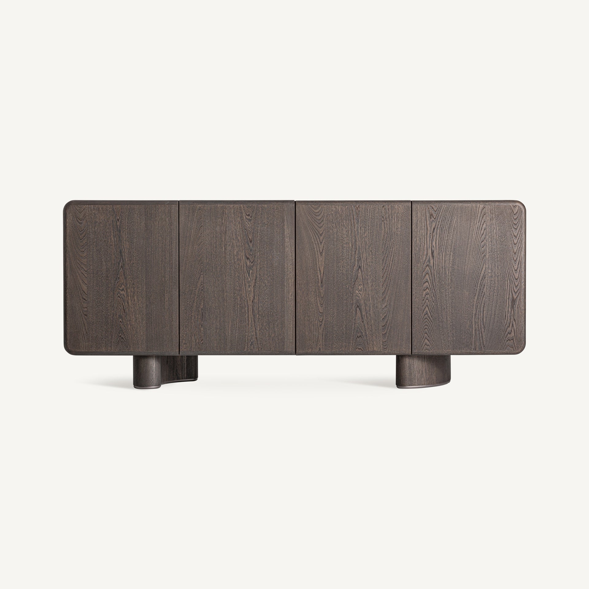 Бюфет Pravia, стил съвременен, изработен от MDF дървесина в кафяво, комбиниран с кафяв шперплат. Продуктът е разглобяем.