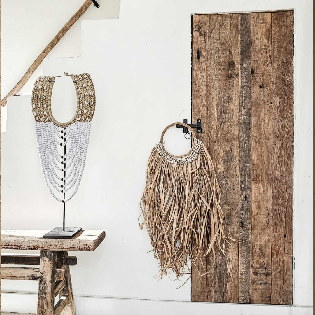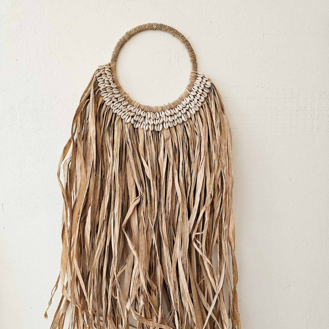 Това е красива комбинация! Закачалка за стена от рафия с покритие от черупка каури. Тази закачалка изглежда красиво и плажно на вашата стена.