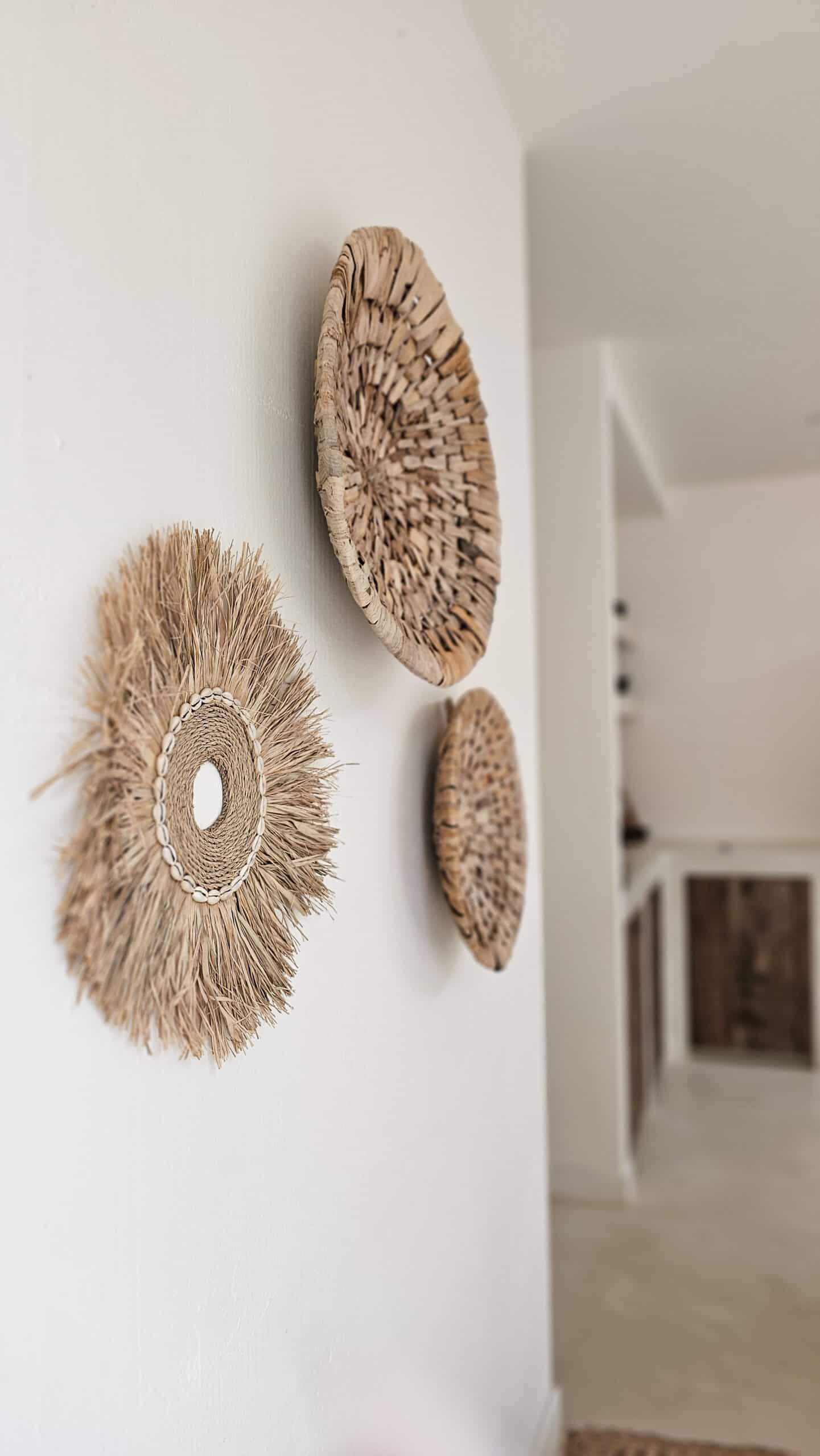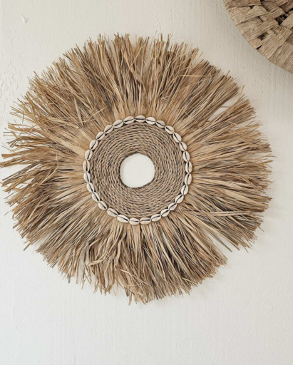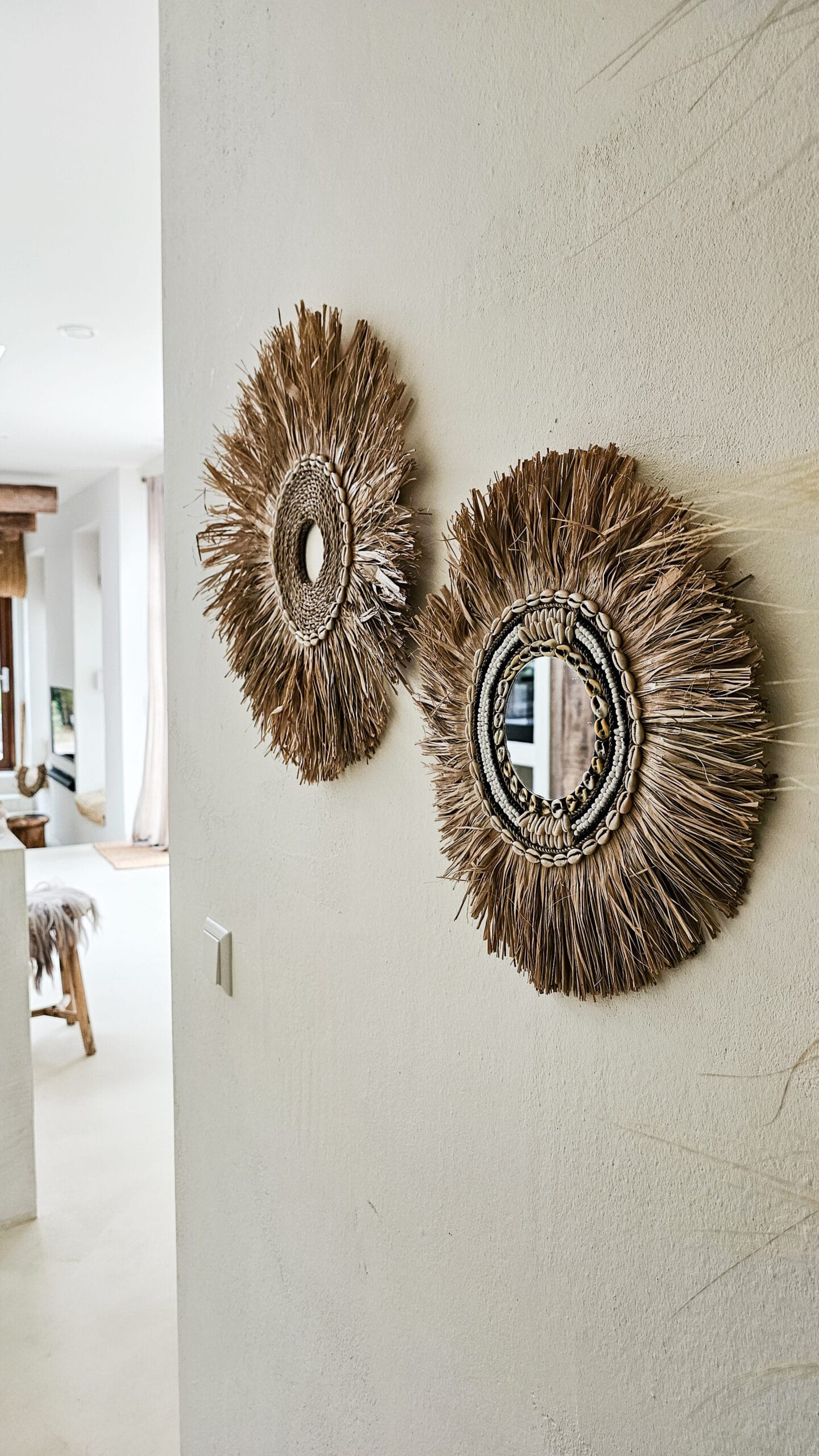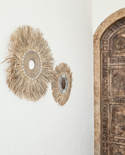 Удобно за комбиниране с други кръгли декорации за стена или огледало от рафия.