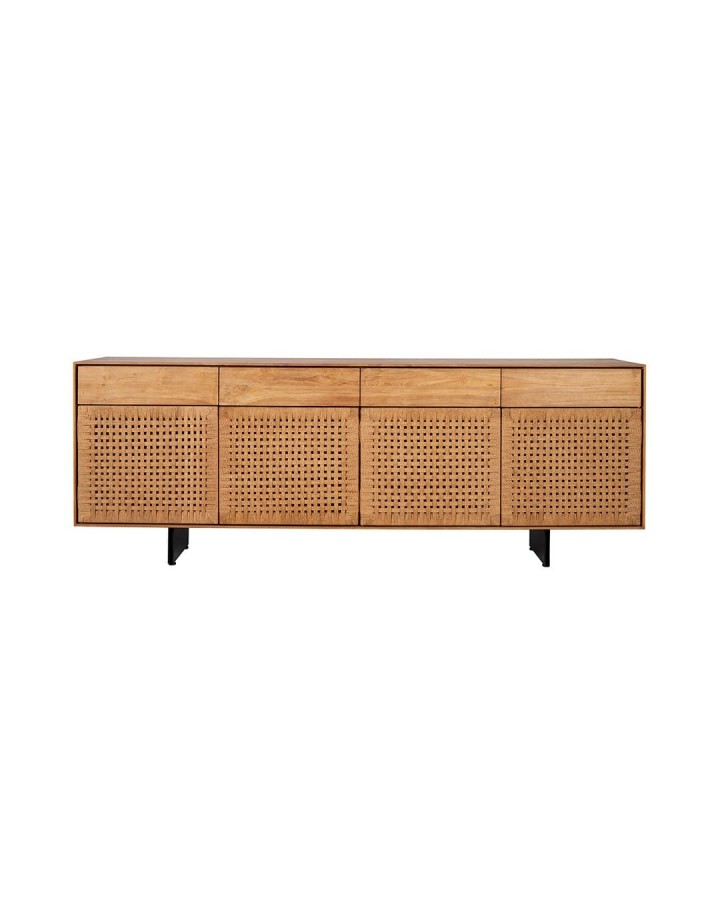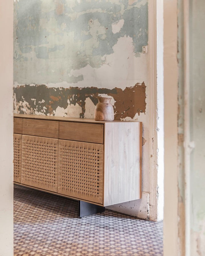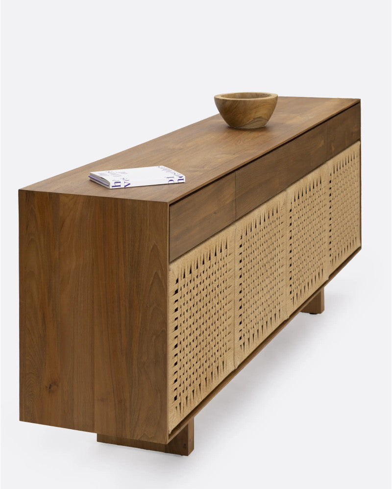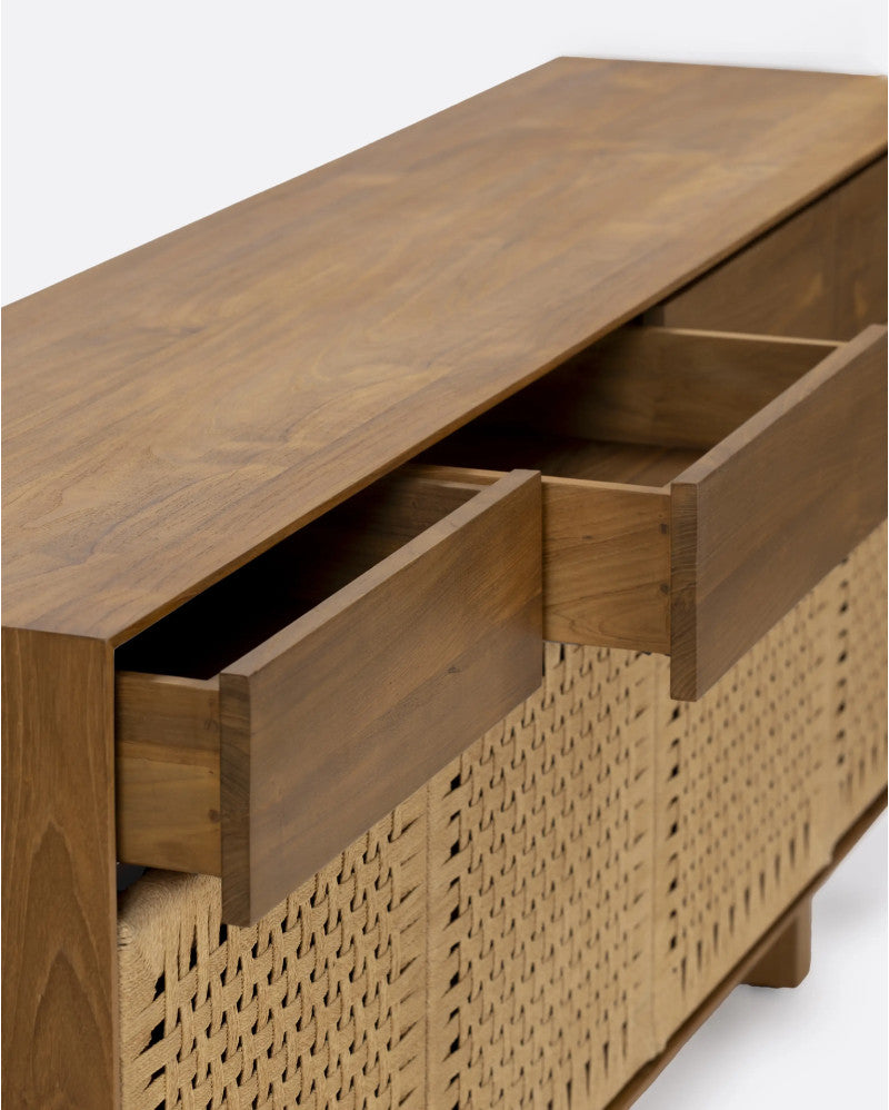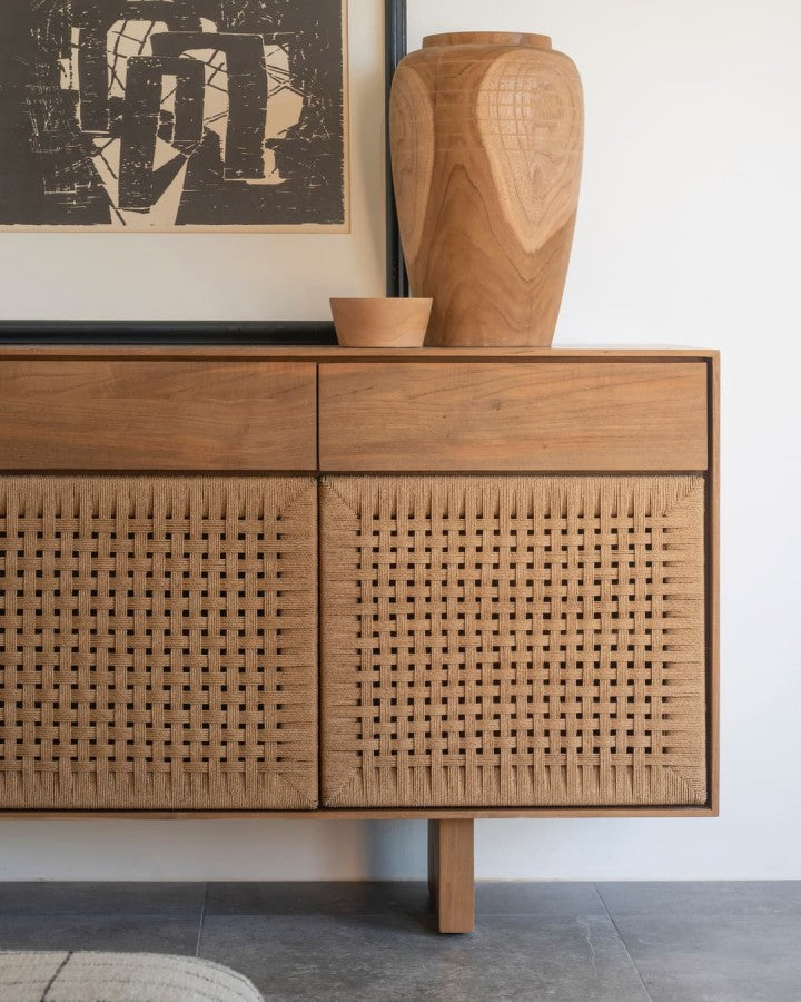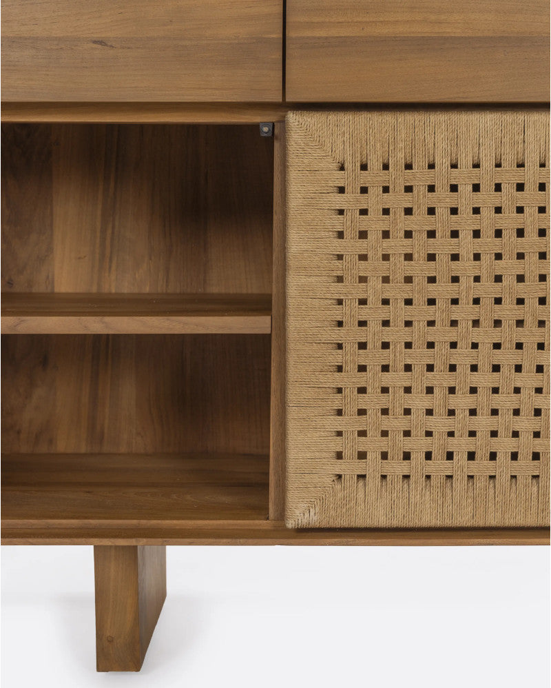 - Красив бюфет в рустик стил с гладко покритие, ръчно изработен от естествено регенерирано тиково дърво и хартиено въже. Цялата конструкция на бюфета е изработена от рециклирано тиково дърво, включително оригиналните крака и двете горни чекмеджета. Вратите, облицовани с въжета, придават онзи мек контраст, който толкова харесваме. Принадлежи към колекцията RARA, която се откроява с характерното си оплетка, ръчно изработена от нашите експерти майстори. Екологичните сплитки от хартиено въже, заедно с естествената структура от рециклирано тиково дърво, възстановена от стари изоставени сгради в Ява, правят мебелите RARA перфектен съюзник за тези, които обичат устойчивия дизайн. Идеален бюфет за очарователно входно антре, коридор, баня или спалня.