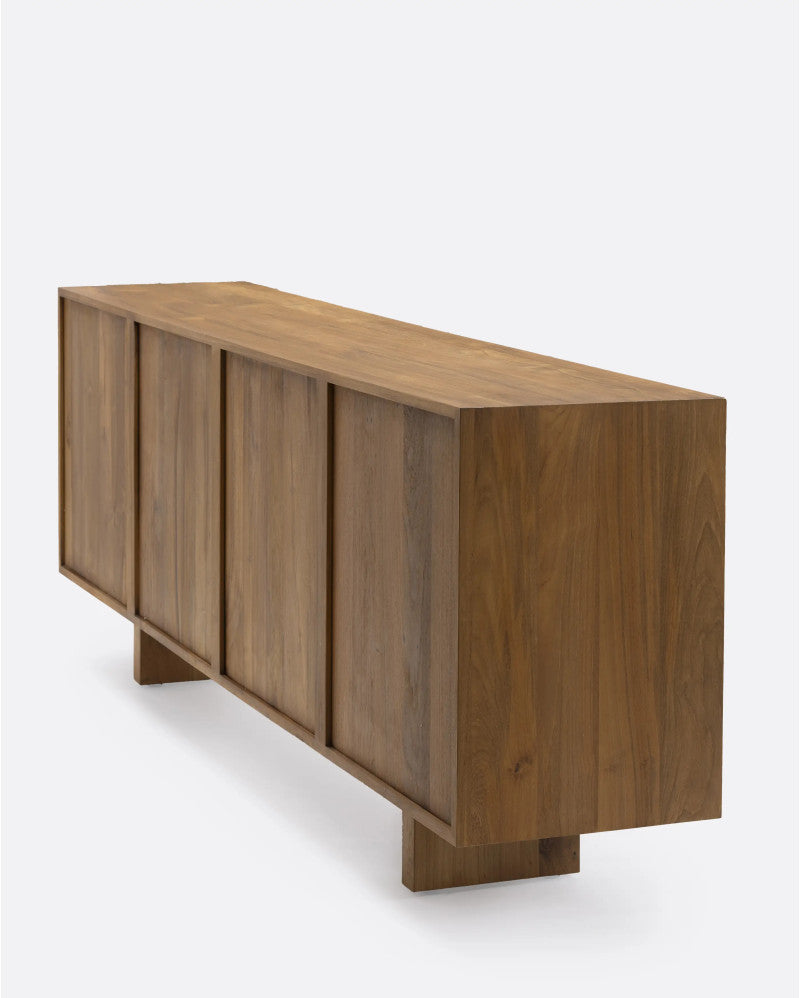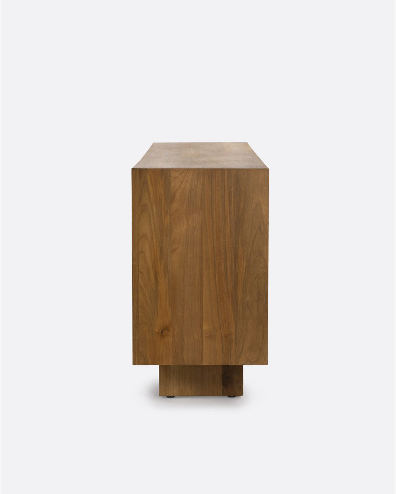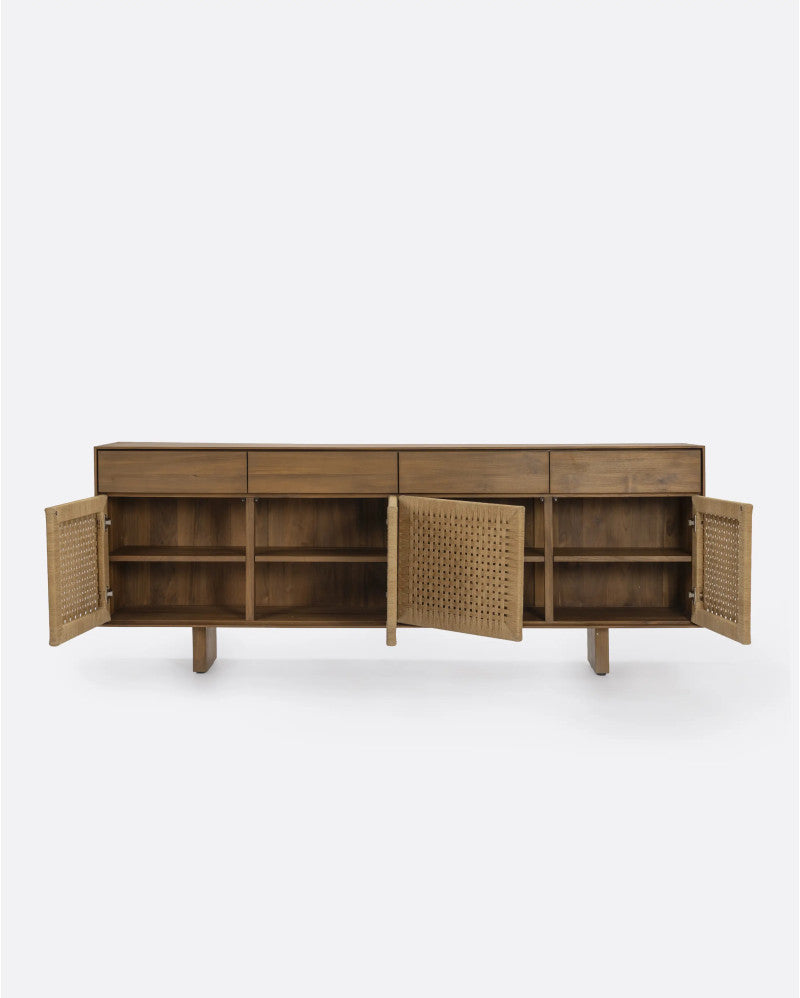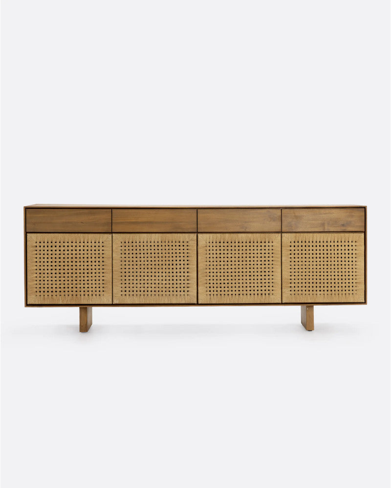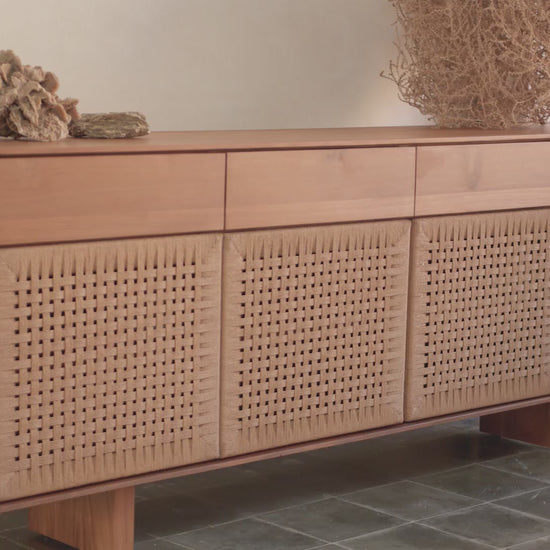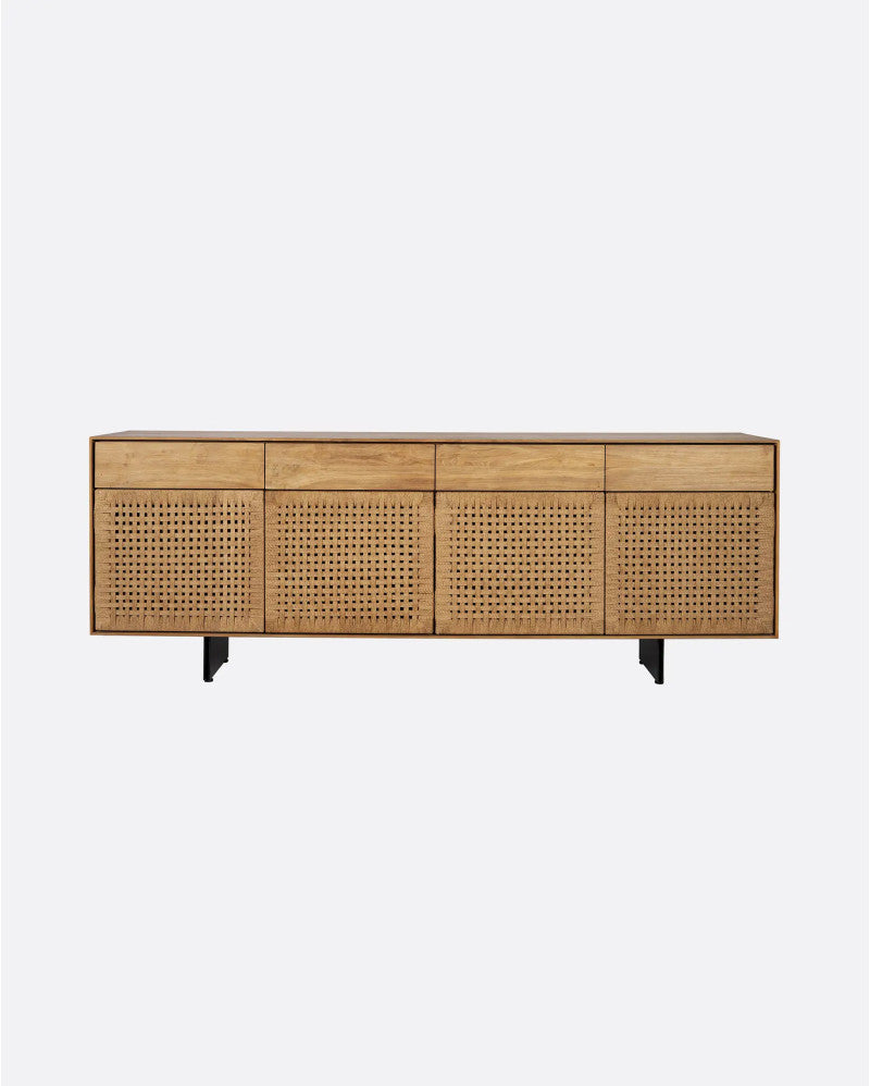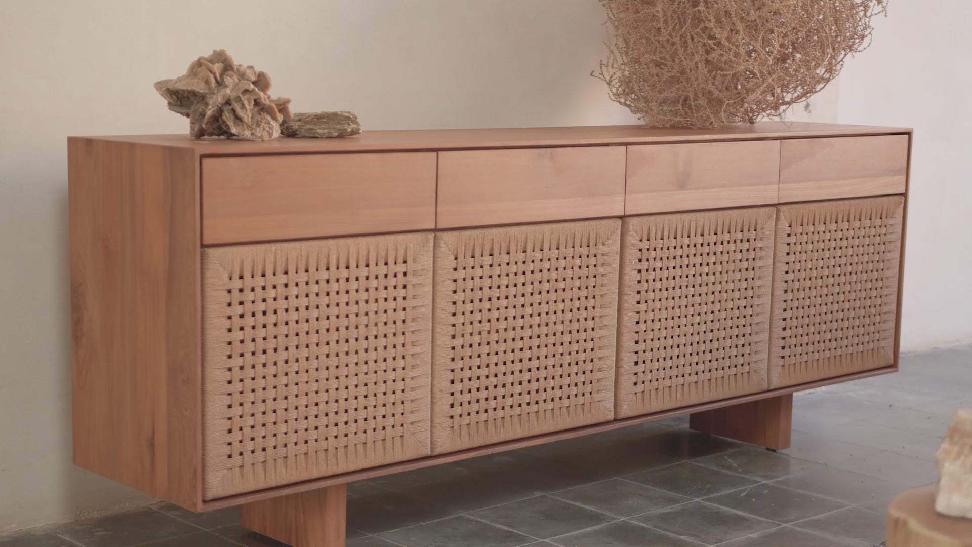 - Красив бюфет в рустик стил с гладко покритие, ръчно изработен от естествено регенерирано тиково дърво и хартиено въже. Цялата конструкция на бюфета е изработена от рециклирано тиково дърво, включително оригиналните крака и двете горни чекмеджета. Вратите, облицовани с въжета, придават онзи мек контраст, който толкова харесваме. Принадлежи към колекцията RARA, която се откроява с характерното си оплетка, ръчно изработена от нашите експерти майстори. Екологичните сплитки от хартиено въже, заедно с естествената структура от рециклирано тиково дърво, възстановена от стари изоставени сгради в Ява, правят мебелите RARA перфектен съюзник за тези, които обичат устойчивия дизайн. Идеален бюфет за очарователно входно антре, коридор, баня или спалня.