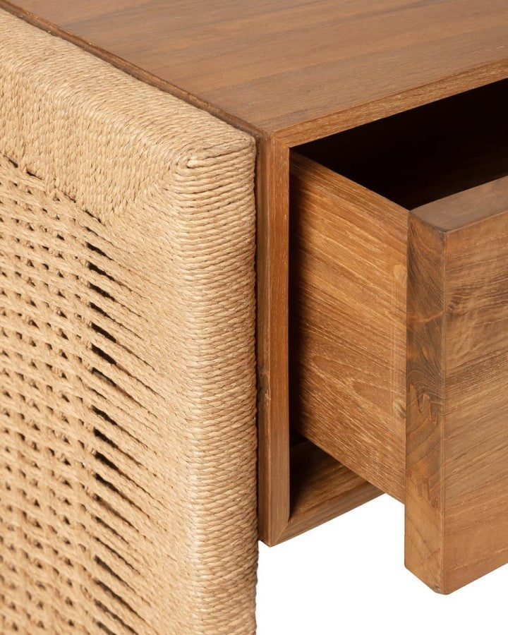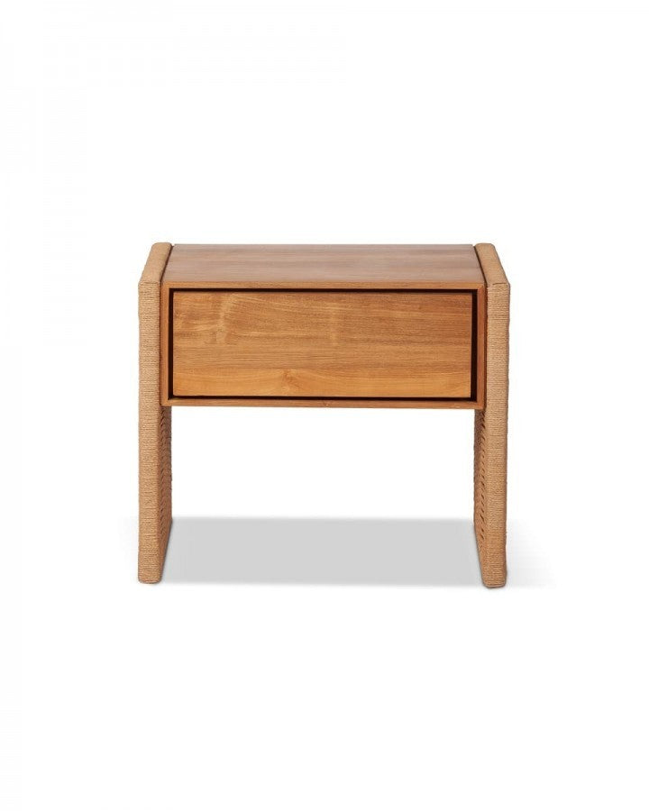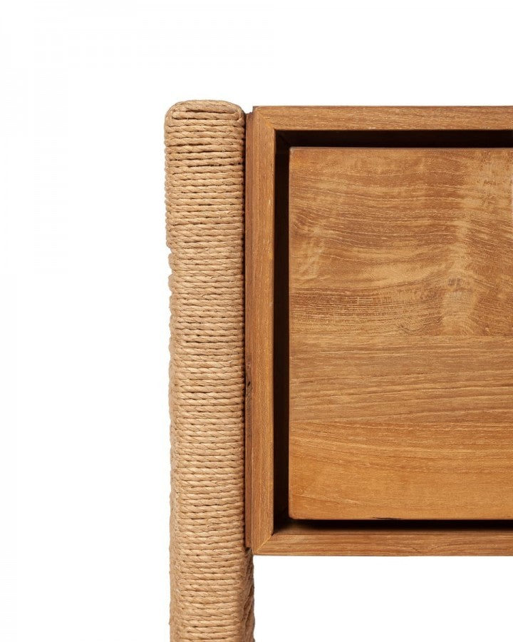 - Нощното шкафче RATA, подхождащо на легло TAROK, ще ви накара да се влюбите в елегантната си форма и оригинална текстура. Нощно шкафче, което комбинира регенерирано тиково дърво и естествено въже, създавайки екологична и устойчива мебел. В допълнение, дизайнът на чекмеджето и страничните крака осигуряват голям визуален комфорт и го правят много практично нощно шкафче. Ръчно изработено парче от колекцията RATA, което се отличава със своите гладки линии и функционален завършек. Романтичният и минималистичен стил ще придаде свежо излъчване на вашата спалня. Тиковото дърво, извлечено от стари изоставени сгради в Индонезия, се съчетава идеално с фината оплетка от екологично хартиено въже, изтъкано ръчно от нашите опитни занаятчии. Това нощно шкафче от естествено регенерирано тиково въже пасва перфектно на леглото от същата колекция и е за стаи, в които искате да подобрите бохемската атмосфера и контакта с природата.