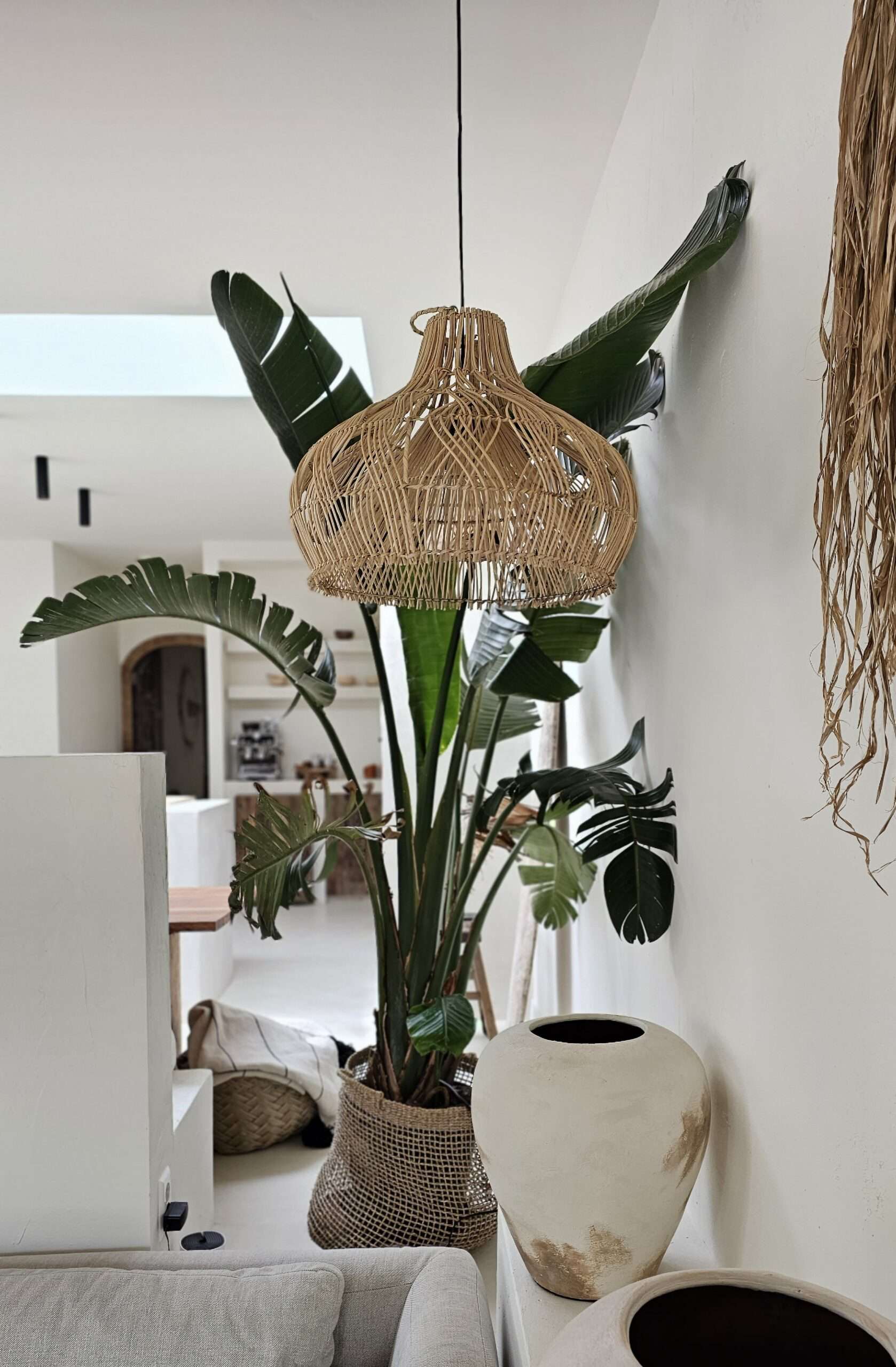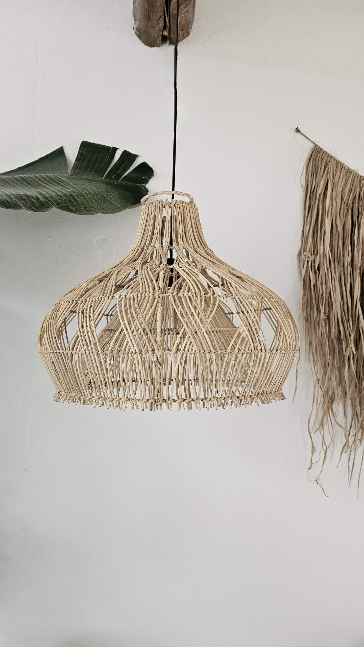 Тази топчеста лампа има красива елегантна форма. Това е хубав междинен размер за окачване над масата за хранене самостоятелно или с няколко души. Тази форма е малко по-вълнуваща от правите ратанови висящи лампи, така че изглежда страхотно и в скучен ъгъл.