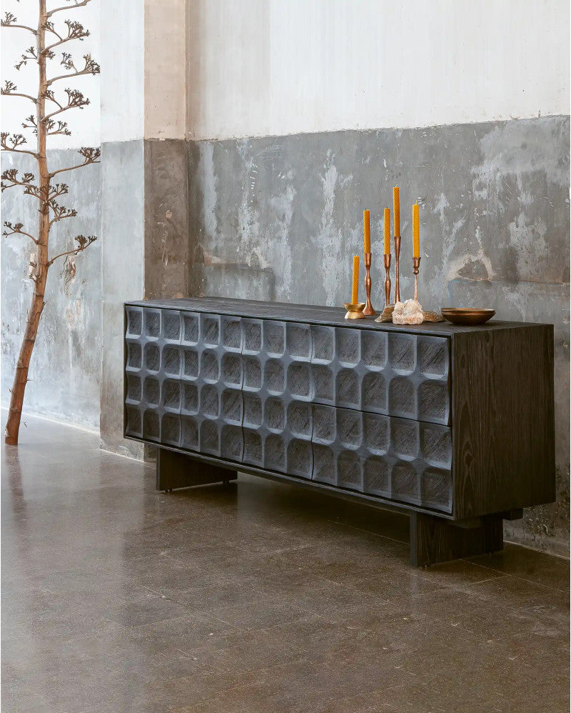 Бюфетът RIJA Black 223 се откроява с интензивния си черен цвят и несравнимия си блясък. Мебел за всяко пространство, изработена от дърво сункай. Толкова е елегантен, колкото и поразителен, в перфектно съчетание от дизайн и баланс. Един от деликатесите на семейство RIJAL, който се откроява със своя рустик и мек стил, който ни пренася в състояние на спокойствие и към най-естествената ни същност, благодарение на фините си линии, но с тежест. Висококачествена дървесина, обработена от нашите експерти майстори. RIJAL Black е идеалната мебел за дневни в минималистичен, класически или екзотичен стил, перфектно комбинирана с пълната гама от бели, кремави, сиви и всякакви детайли в по-ярки цветове.