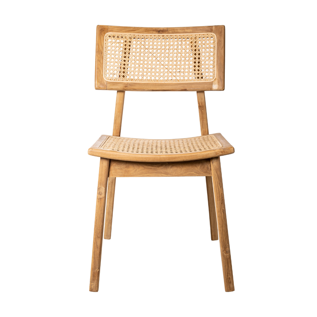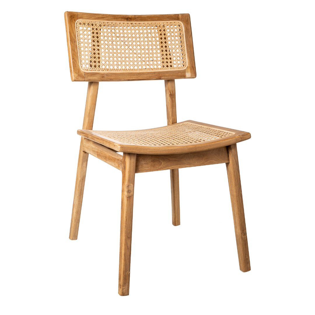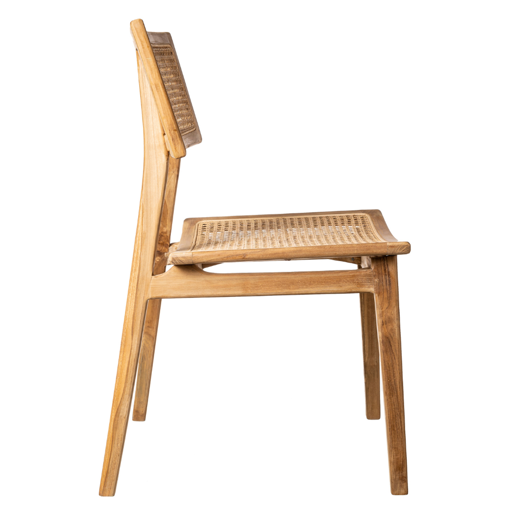 Елегантен подреждащ се стол, изработен от масивно тиково дърво с естествено покритие. С плетена облегалка, височина на седалката 45 см и компактни размери. Идеален за вътрешна или открита обстановка, съчетаващ издръжливост, комфорт и вечен дизайн.